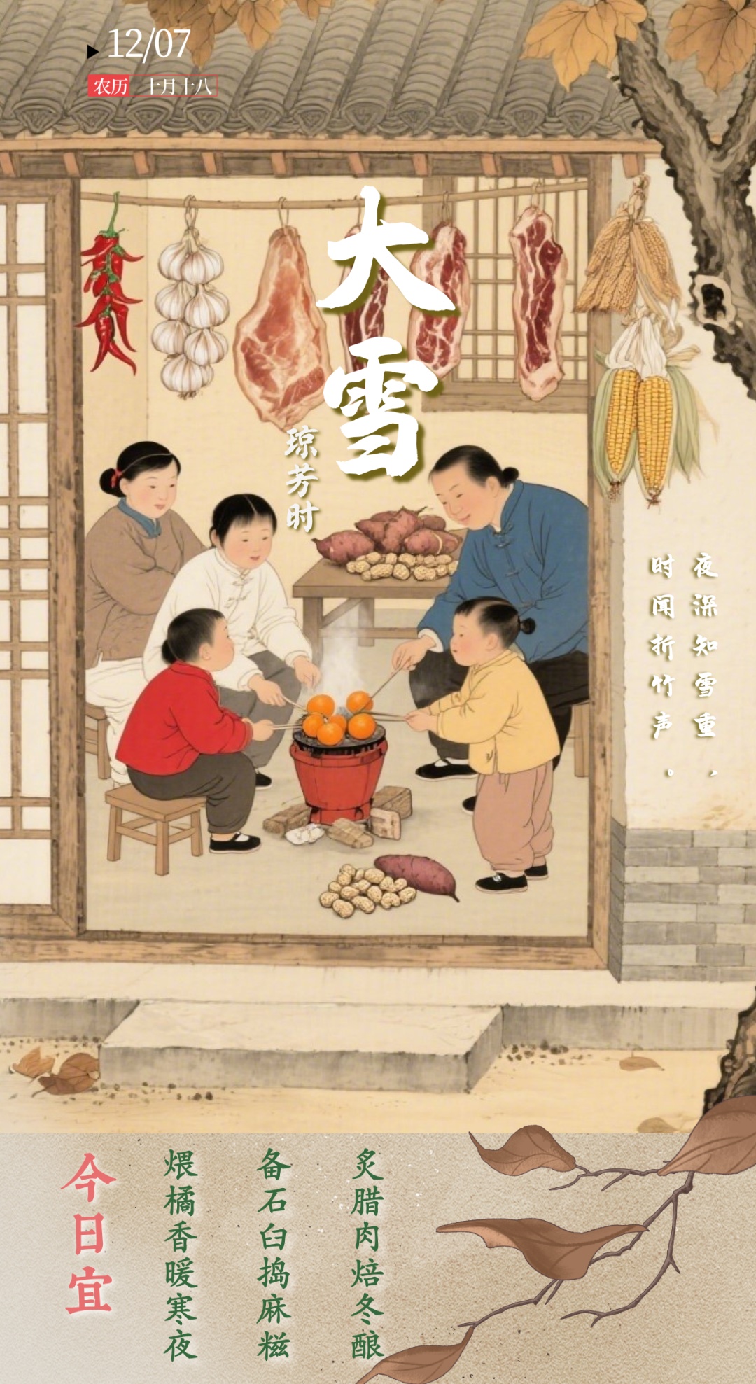 城市生活节奏虽越来越快,大雪时节的习俗与习惯,依然扎根在上海人的生活中。腌肉时的精心准备,煮粥时的耐心等待,赏梅时的闲情逸致,让人们在忙碌的生活中慢下来,感受季节的变化,品味生活的美好。对过往岁月的追忆,对文化根脉的传承,也像冬日的暖阳,温暖着人们的心灵,让上海的冬天更具韵味与温度。