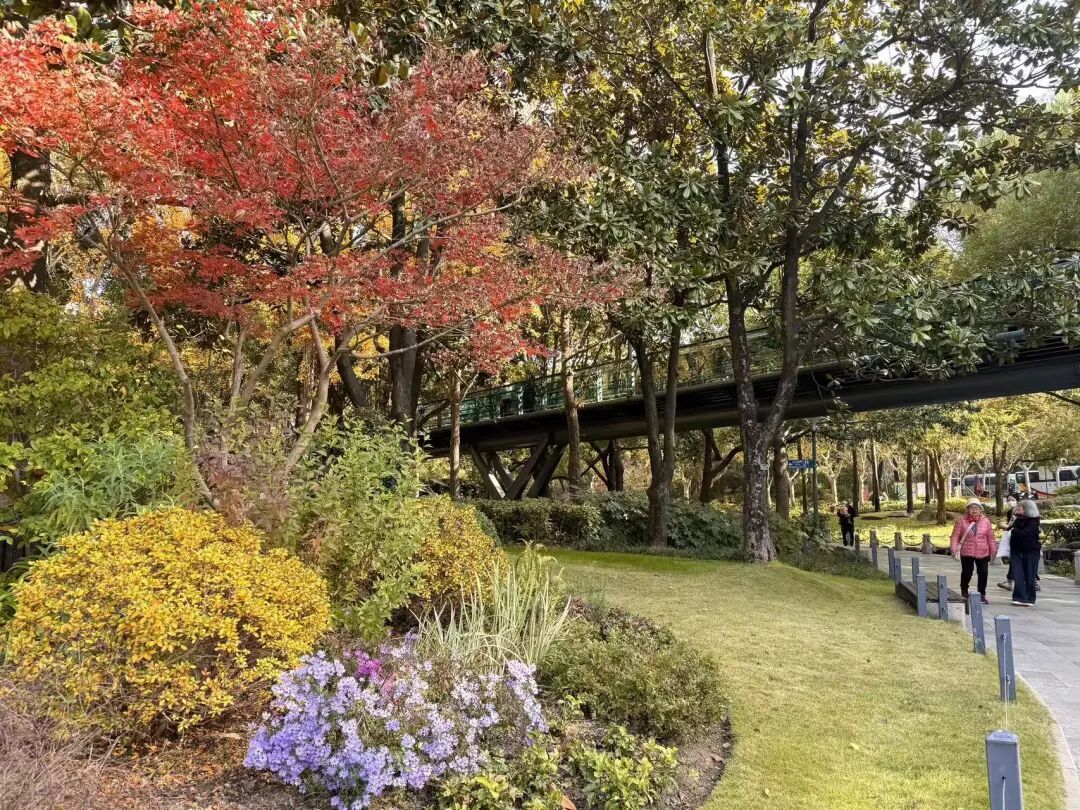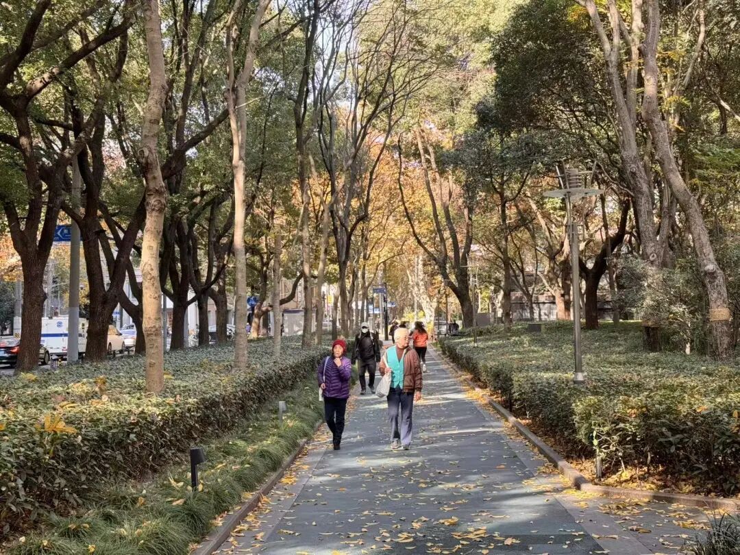 今日申城暖阳普照,风力虽大,户外体感依旧温和。徐家汇公园内落叶满地,梧桐枝桠渐疏。不少市民来此休闲,有的沿步道慢跑,有的在空地上打羽毛球,湖畔长椅则坐满了悠闲晒太阳的人们。湖面波光粼粼,锦鲤与乌龟自在游弋,更添生趣。