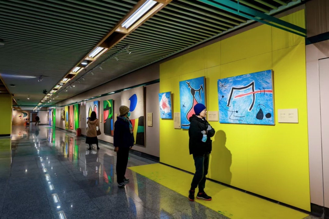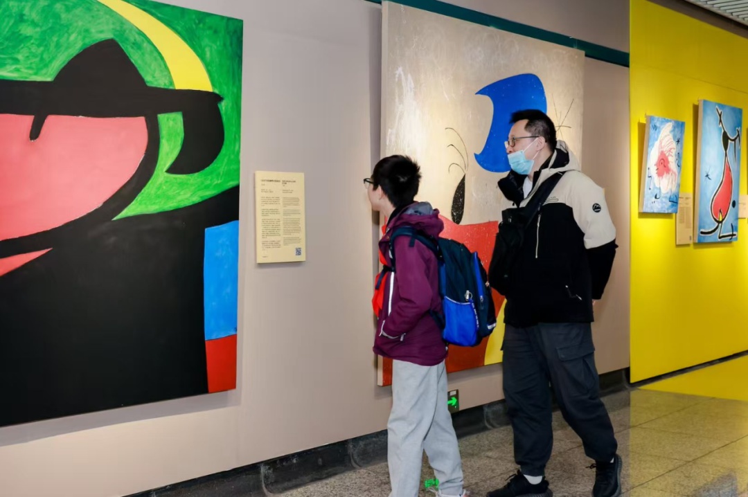 展览现场热闹而有序,不少乘客被画作中斑斓的色彩与超现实的意境吸引,有人放慢脚步静静品味线条与色彩交织的奇幻叙事,有人举起手机拍照打卡,让梦境般的艺术品成为朋友圈的独特背景。刚下班的陈女士特意与胡安·米罗的自画像合影,她笑着说:“每天都坐地铁经过这里,今天突然发现变成了艺术展,太惊喜了!米罗的画像闯进了梦境,色彩特别治愈。”带着孩子观展的张先生则表示:“接孩子放学正好路过。孩子对画里的线条和色块特别感兴趣,还问我是不是外星人画的。这种沉浸式的艺术体验,比逛美术馆更接地气。”