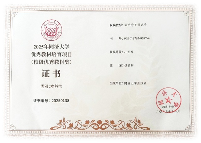 近日,同济大学优秀教材培育项目(即校级优秀教材奖)评选结果揭晓。由同济大学附属同济医院程黎明教授主编、同济大学出版社出版的《运动骨关节病学》教材,凭借其前沿的学科内容、科学的体系设计以及突出的教学适用性,荣获一等奖。该奖项的获得,不仅是对教材"培根铸魂、启智增慧"价值的高度认可,更是课程团队长期深耕教学一线、持续推进课程与教材一体化建设的标志性成果。