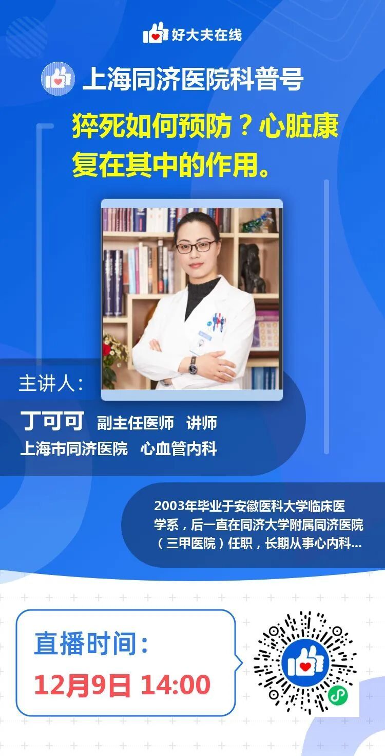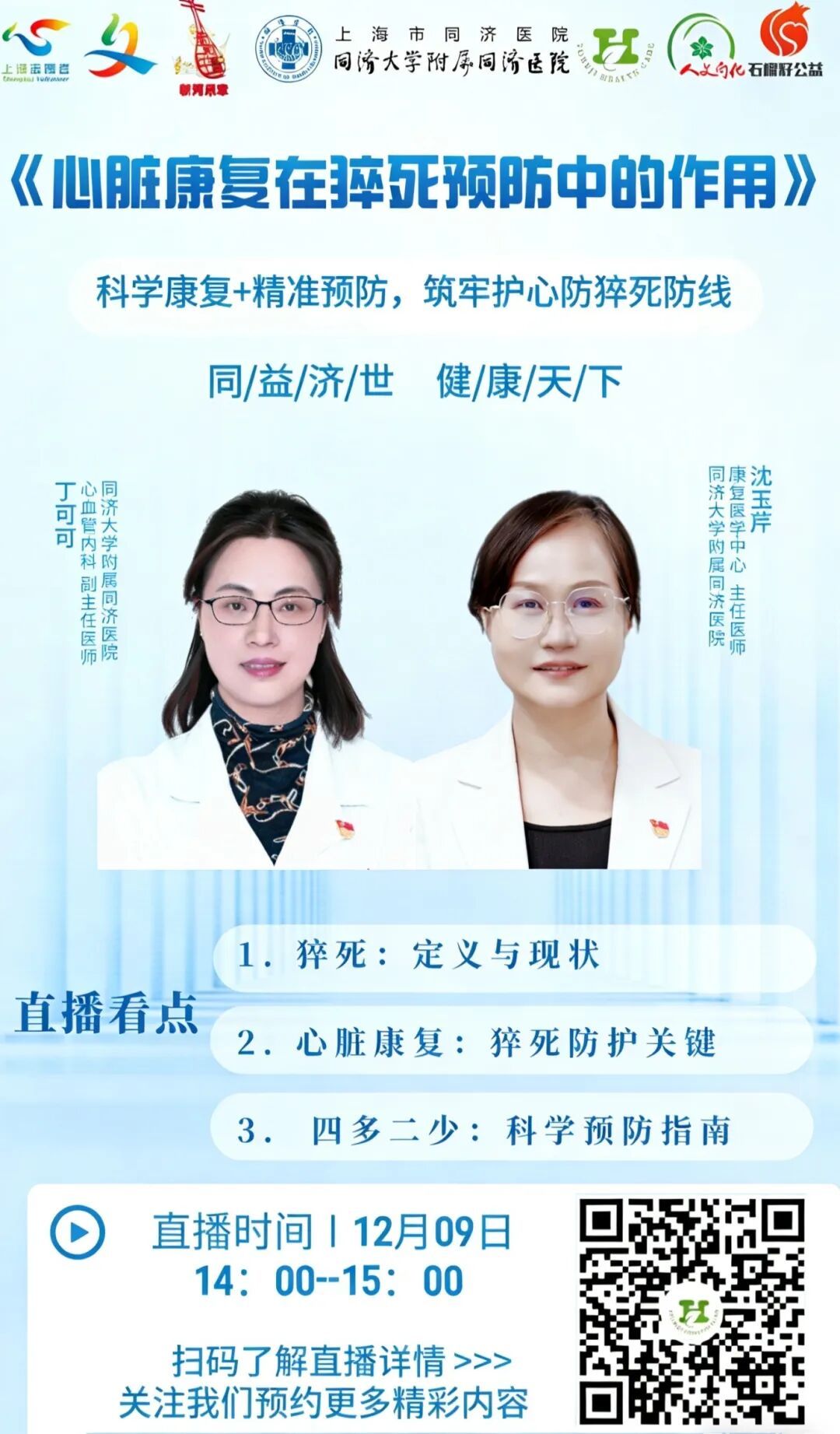 12月9日14:00由上海市志愿者协会指导,同济大学附属同济医院、上海市崇明区新时代文明实践中心、上海市崇明区向化镇人民政府、上海市崇明区新河镇人民政府主办,同济医院体检与健康管理医学中心、康复医学中心、社会工作部、上海崇明石榴籽公益发展中心联合承办的《心脏康复在猝死预防中的作用》主题直播即将开启!
