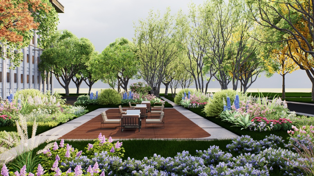 以折线为核心元素,金属石材的锐利转折凸显现代感,搭配植物与铺装的自然折线,软硬材料虚实对比,实现人工与自然共生,营造简约有温度的公共空间。