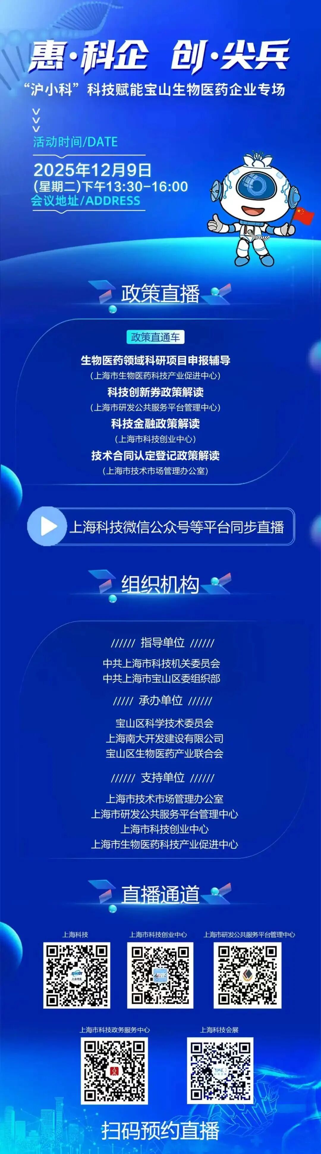 生物医药领域科研项目如何申报?上海科技金融政策有哪些?什么是上海市科技创新券?申请须具备哪些条件?如何办理技术合同认定登记,应准备哪些材料?该如何选择登记处?在市科技机关党委和宝山区委组织部指导下,12月9日13:30将举办“沪小科”科技志愿服务活动,针对大家关心的热点政策邀请专家直播宣讲,欢迎广大科技企业预约观看!