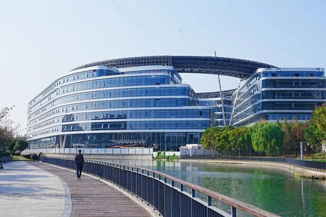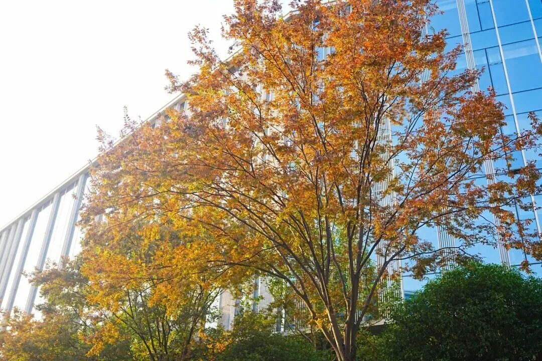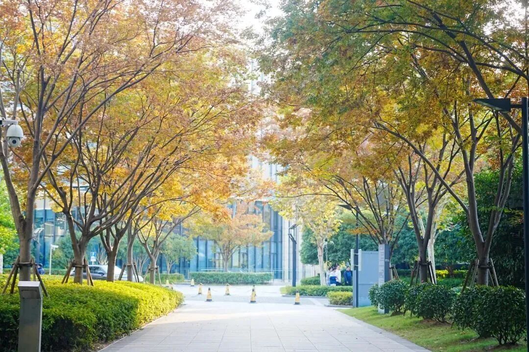 IBP国际商务花园二期紧邻着苏州河,这里有一条“时空隧道”——道路两侧种植着成排的高大榉树,现在变成热烈温暖的橙红色,像是寒冬里一杯泡着橙子和肉桂的热红酒。