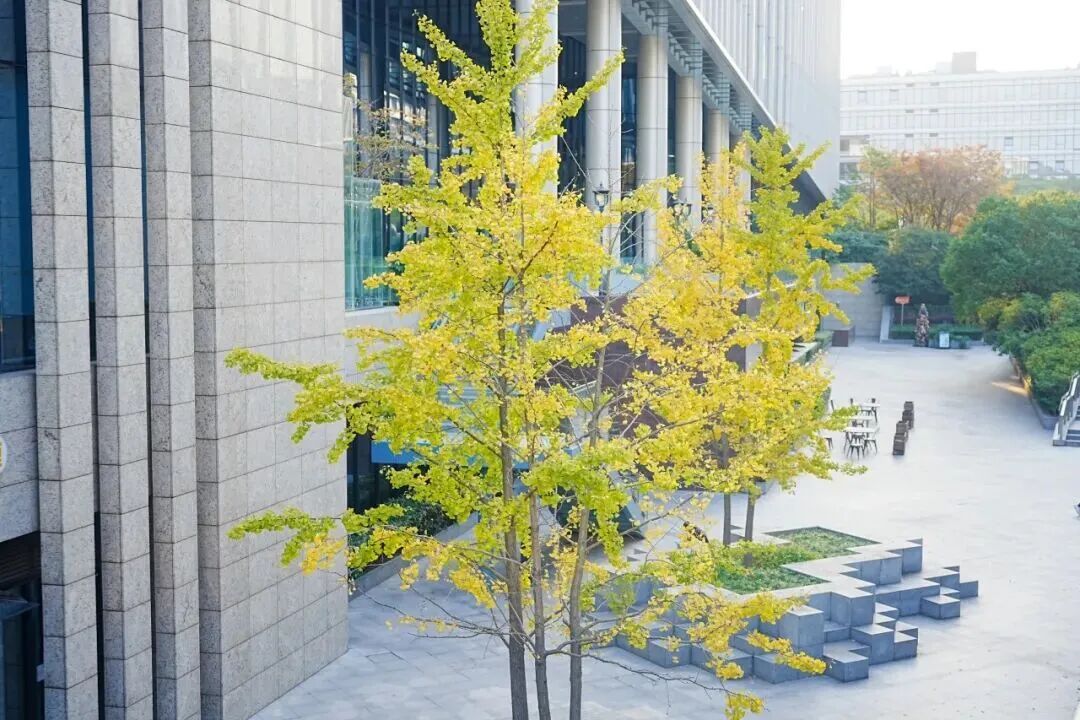 二期的下沉式广场当中有几株颇为高大的银杏树,时下通体金黄,与四周冷色调的现代建筑物形成鲜明对比,是一道别具一格的风景。