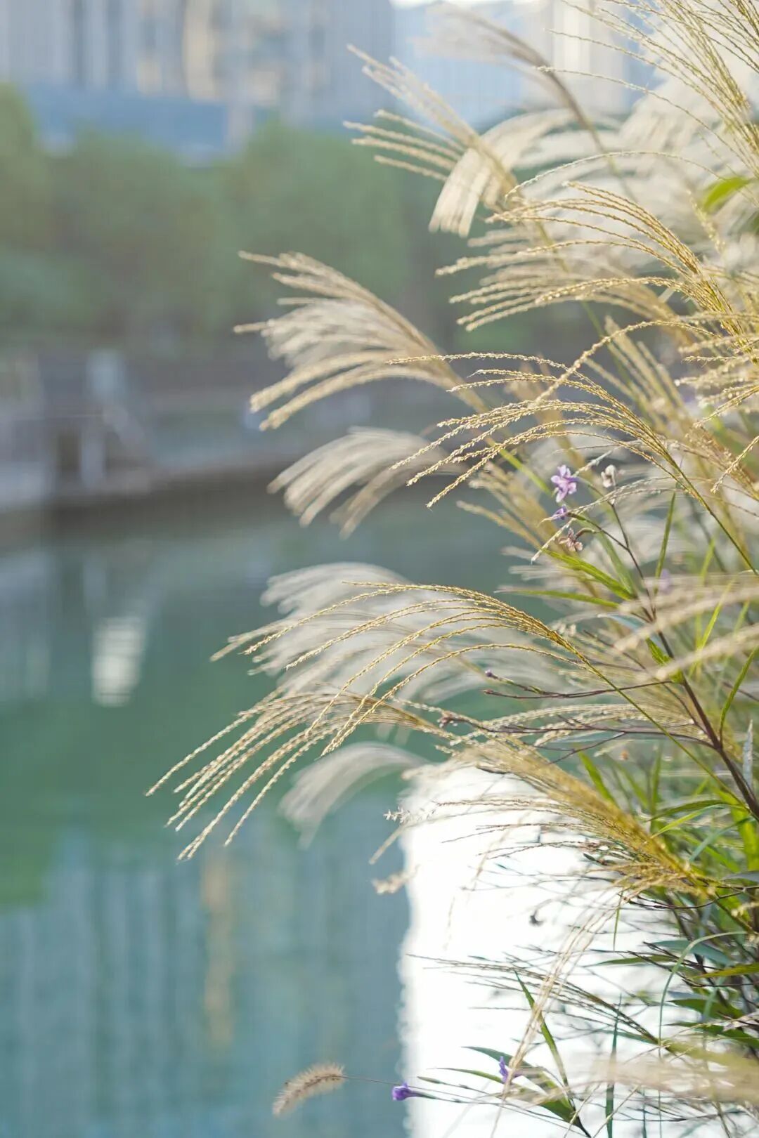 每年这个时节,这里的河岸还有一道不容错过的风景——各种观赏草由绿转黄,毛茸茸的草叶在风中轻轻摇晃,带着野草独有的坚韧。