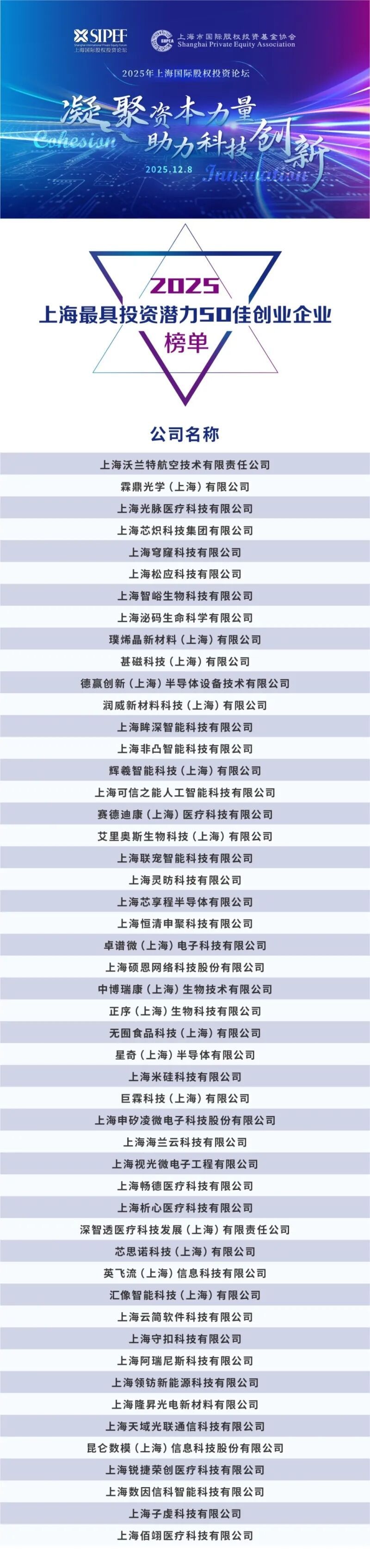 12月8日,“2025上海最具投资潜力50佳创业企业评选”榜单在“第十八届上海国际股权投资论坛”(SIPEF)上正式揭晓,上海市杨浦区委副书记、区长周海鹰出席论坛并致辞。上海市中小企业发展服务中心(上海市中小企业上市促进中心)主任贾勉发布50佳企业榜单。复旦大学经济学院院长张军做“到底怎么看中国经济这些年的变化?”主题演讲。 在上海市经济和信息化委的指导下,自今年6月起,上海市促进中小企业发展协调办公室、上海市中小企业发展服务中心(上海市中小企业上市促进中心)、上海市国际股权投资基金协会、上海股权投资协会、上海市创业投资行业协会等各方共同举办了“创客上海2025”暨第十届“创客中国”上海市中小企业创新创业大赛暨最具投资潜力50佳创业企业评选活动。在此之前,上海推荐的12家企业入围“创客中国”全国创业组300强,21家企业入围“创客中国”全国企业组500强,3家企业跻身全国企业组50强榜单,图灵在11月下旬全国总决赛荣获一等奖,霖鼎、佰翊获二等奖。 10月中旬,“2025年上海最具投资潜力50佳创业企业”评选正式启动,百家企业接受了来自金浦、德同资本、上海自贸区基金、火山石投资等机构的10位知名投资人组成专家评委团的背靠背盲选评选活动,并特别邀请了专业征信机构对企业及主要创始人诚信情况做了尽职调查,最终评选产生了“2025年上海最具投资潜力50佳创业企业”榜单。 今年已经是连续第十年组织开展“上海最具投资潜力50佳创业企业评选”,上榜企业被列入“上海市重点培育创业企业库”,沪上3家股权投资协会背后近百家会员单位将聚焦入围榜单企业对接金融资本。据不完全统计,今年上榜企业平均新增股权融资约1.07亿,超70%的企业处于A轮及以后融资轮次;往届上榜企业融资规模超1652.8亿,平均每家第二年新增股权融资达2240万元,其中,2024年上榜企业新增股权融资总计29.1亿,为企业后续融资提供强大背书。