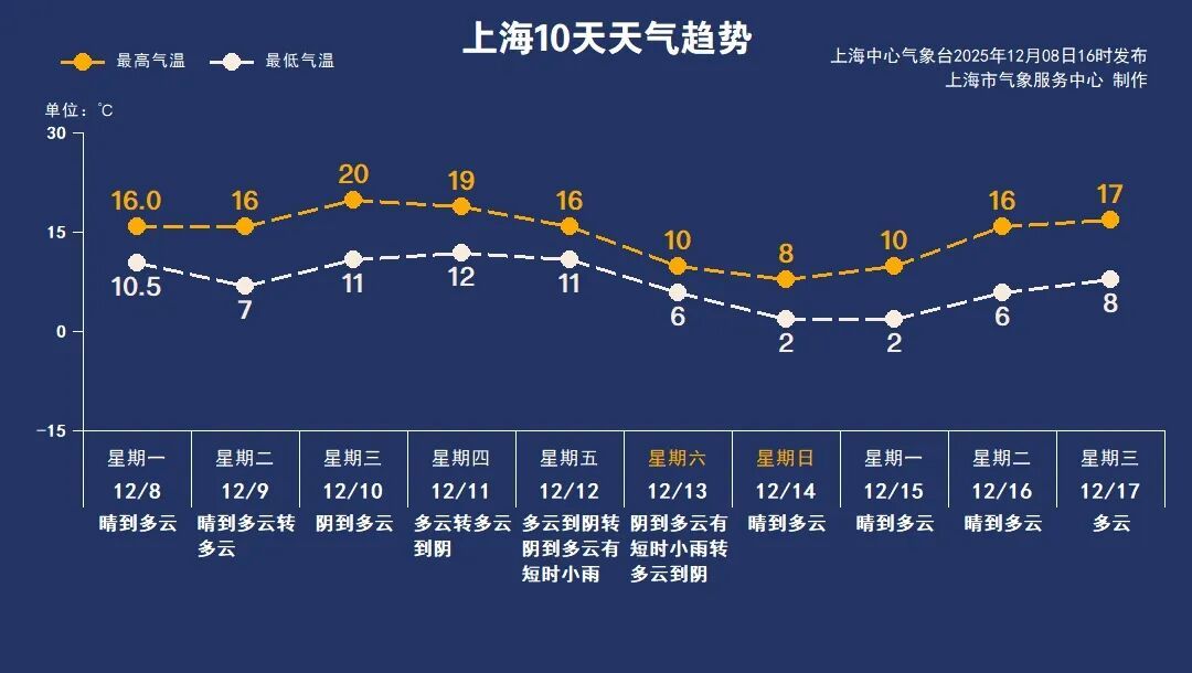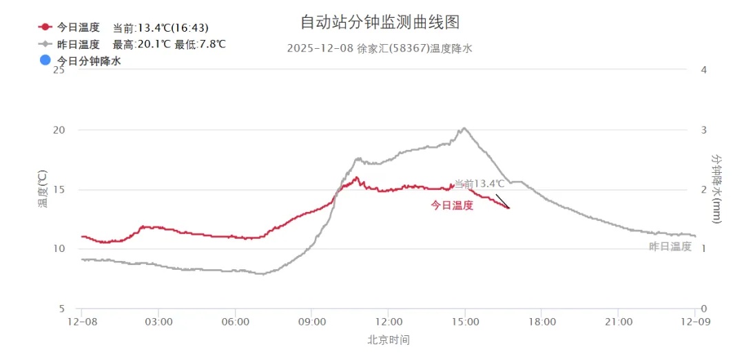白天在弱冷空气影响下,风力有所增强。阳光虽好,气温却实打实回落了,全市最高气温普遍在15~17℃,徐家汇站16.0℃。