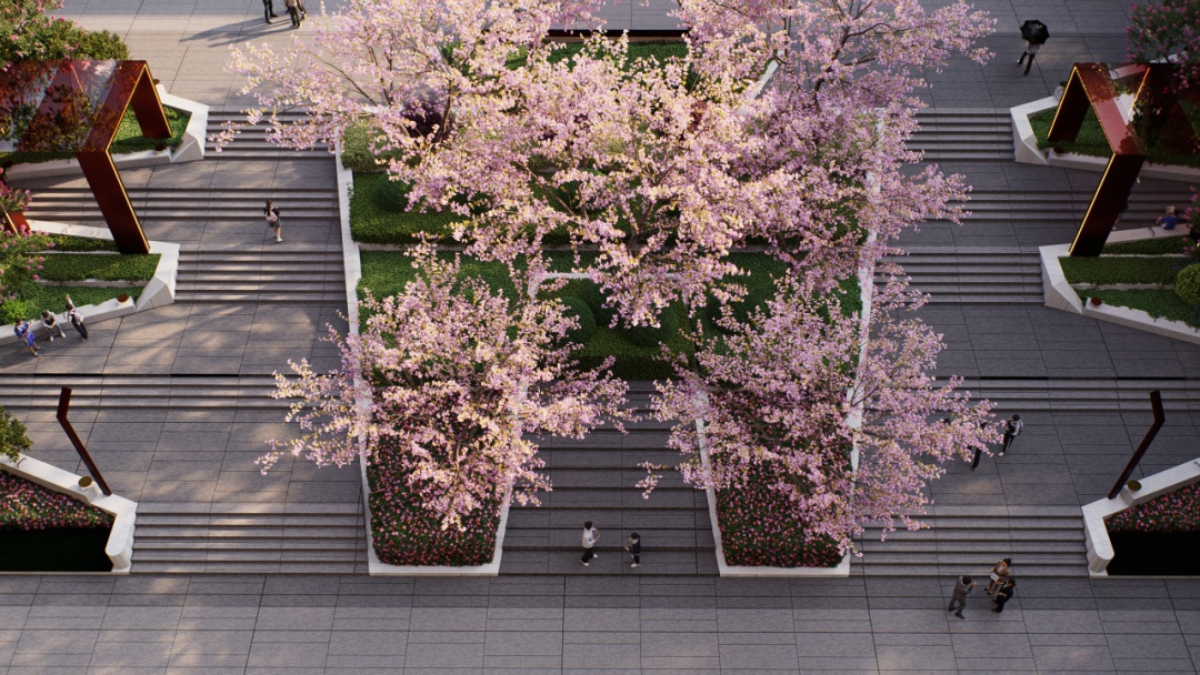 以折线为核心元素,金属石材的锐利转折凸显现代感,搭配植物与铺装的自然折线,软硬材料虚实对比,实现人工与自然共生,营造简约有温度的公共空间。