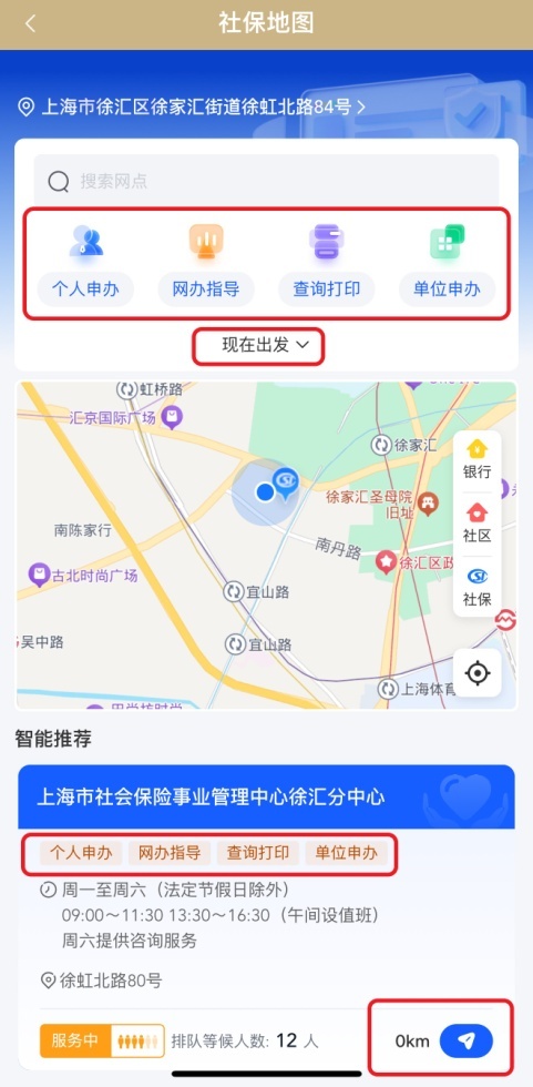 根据个人需求,确定出发时间(选择“现在出发”或“其他时间”)和业务种类(“个人申办”“网办指导”“查询打印”“单位申办”按需勾选),然后按智能推荐的办理网点即可前往办理场所(点击右下角“蓝色箭头”可开启导航)。系统会根据您的实时位置、要办的业务、想办的时间,自动按“最近距离”排序。每家网点还附有“热力显示”,忙、闲一看便知!