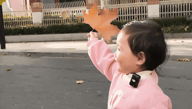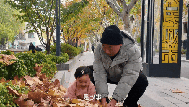 孩子兴奋地将落叶抛向空中,清脆的笑声回荡在街道。
