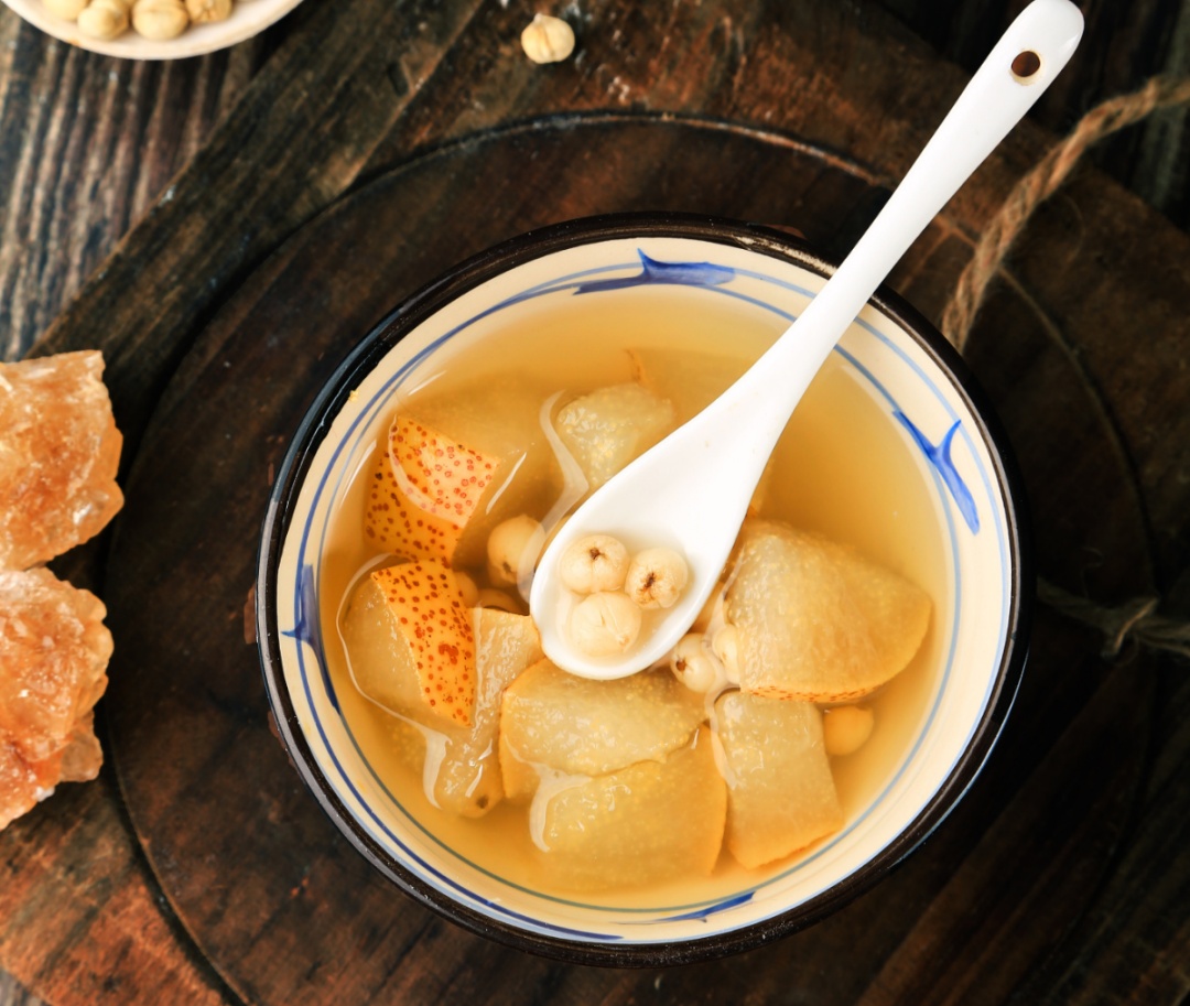功效:雪梨润、莲藕清、蜂蜜补,共同起到滋阴润肺、生津止渴、清热化痰的效果。此膳尤其适合于干燥季节,或肺燥咳嗽、咽喉干痒、皮肤干燥、大便不畅者。注意,不可在沸腾时加入蜂蜜,以免高温破坏其活性成分和营养价值。