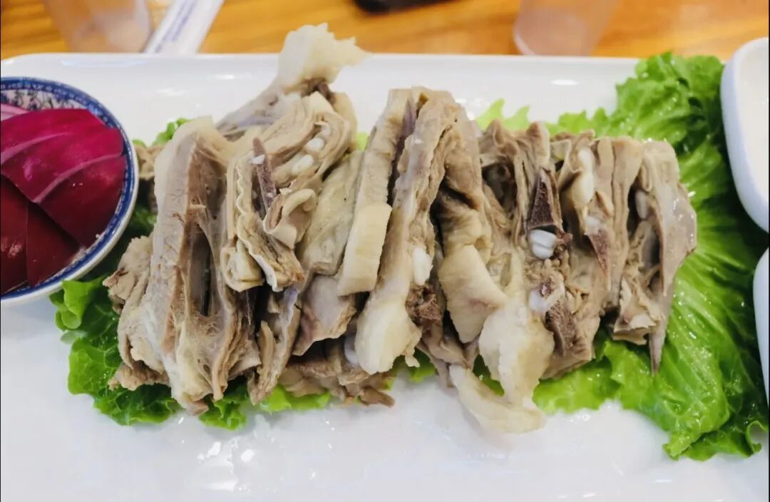 白切羊肉肌理清晰,皮下薄脂近乎透明。肉质精瘦,口味清爽,毫无膻腥。羊肚羊肝咸香适口,鲜香不腻,尽是食材本味。