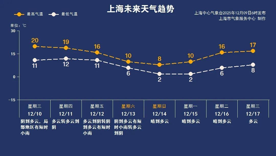 12月10日(周三):阴到多云,局部地区有短时小雨,11~20℃