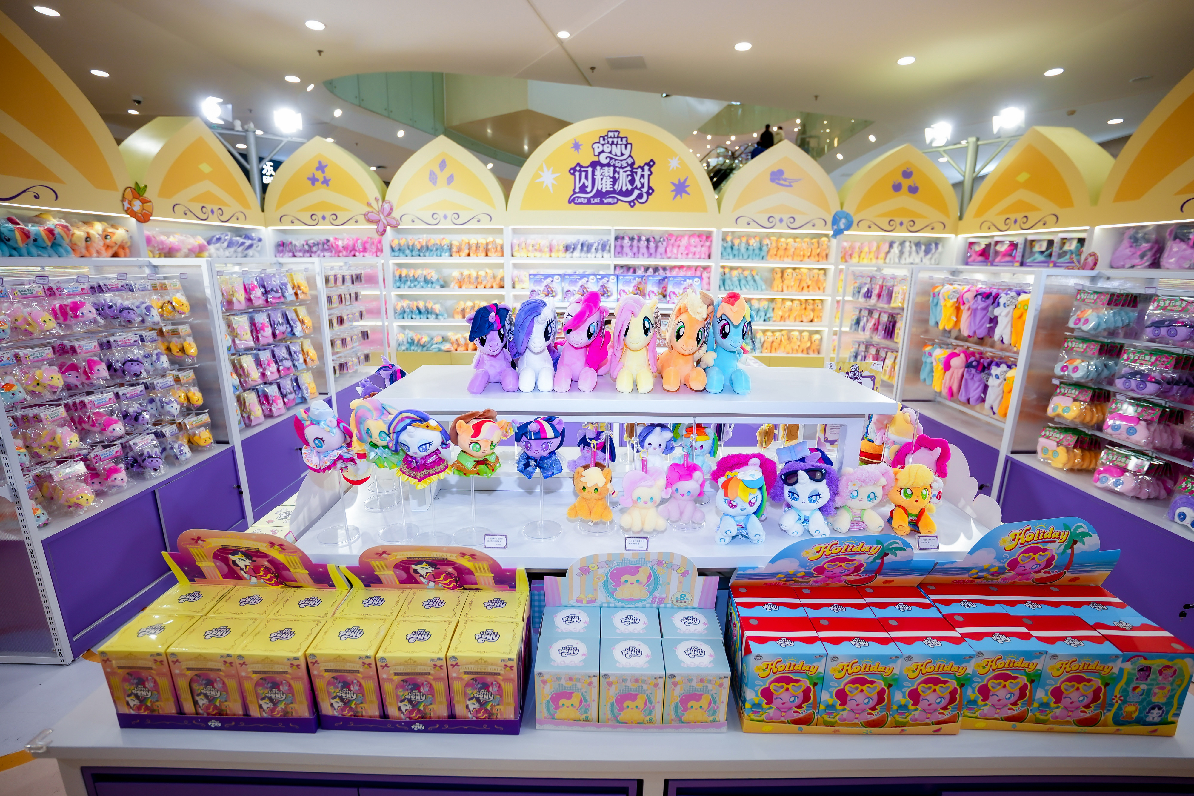 此外,小马宝莉主题快闪店同期亮相A门中庭旁,快闪店打造全新首发区、快闪限定区、经典热卖区三大区域,陈列多款全新首发盲盒、盲袋,近百款快闪限定周边,涵盖吧唧、挂件、徽章等产品,为市民带来丰富的“派对”之选。