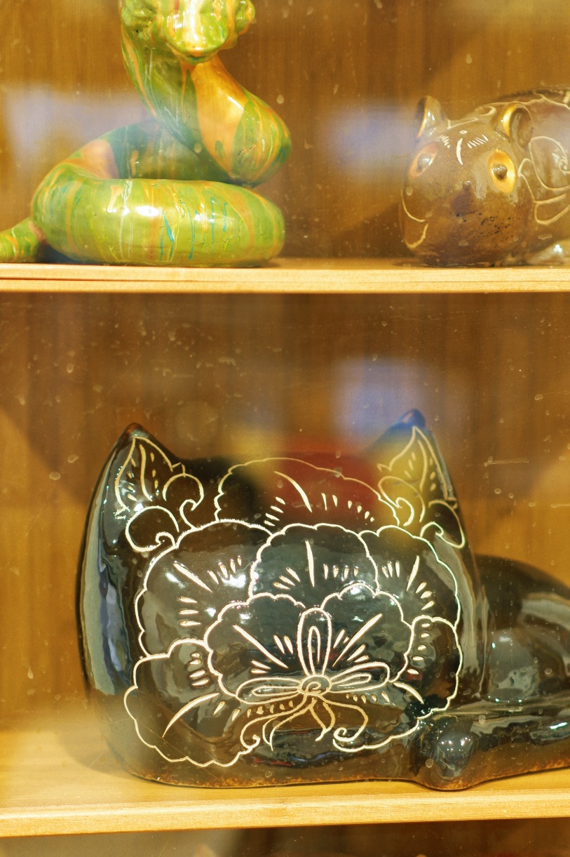 精美的作品让人挪不开目光,有盘踞的陶蛇、憨态可掬的陶猫等动物形态作品,憨萌又传神;有将金山农民画的鲜艳图案刻画在黑陶上的跨界之作;还有勾勒着写意花卉的瓶罐,花瓣舒展、枝叶飘逸,十分雅致。凑近细看,每一件作品都独具匠心。