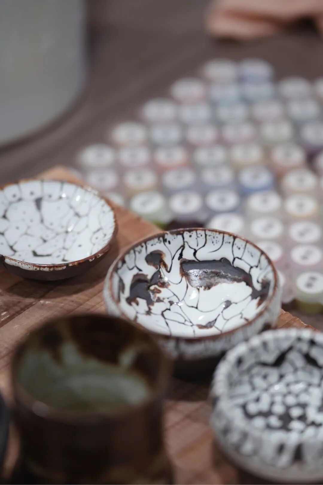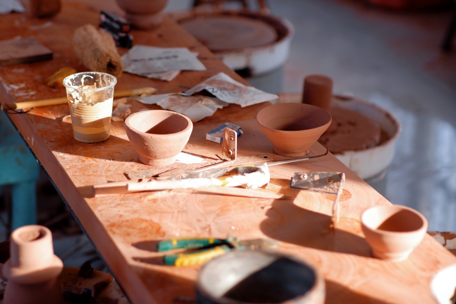 走进拉坯室内,十几台拉坯机整齐排列,木桌上散落着未干的陶泥、塑形工具和几片刚切下的泥条。