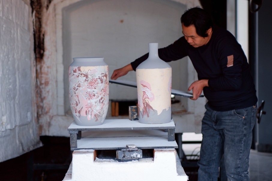 工作人员正小心翼翼地捧着已经上完釉色的黑陶器皿,动作轻柔地将它们送入一旁的窑炉。经过十几个小时的高温烤制后,这些黑陶作品将完成神奇的转化。