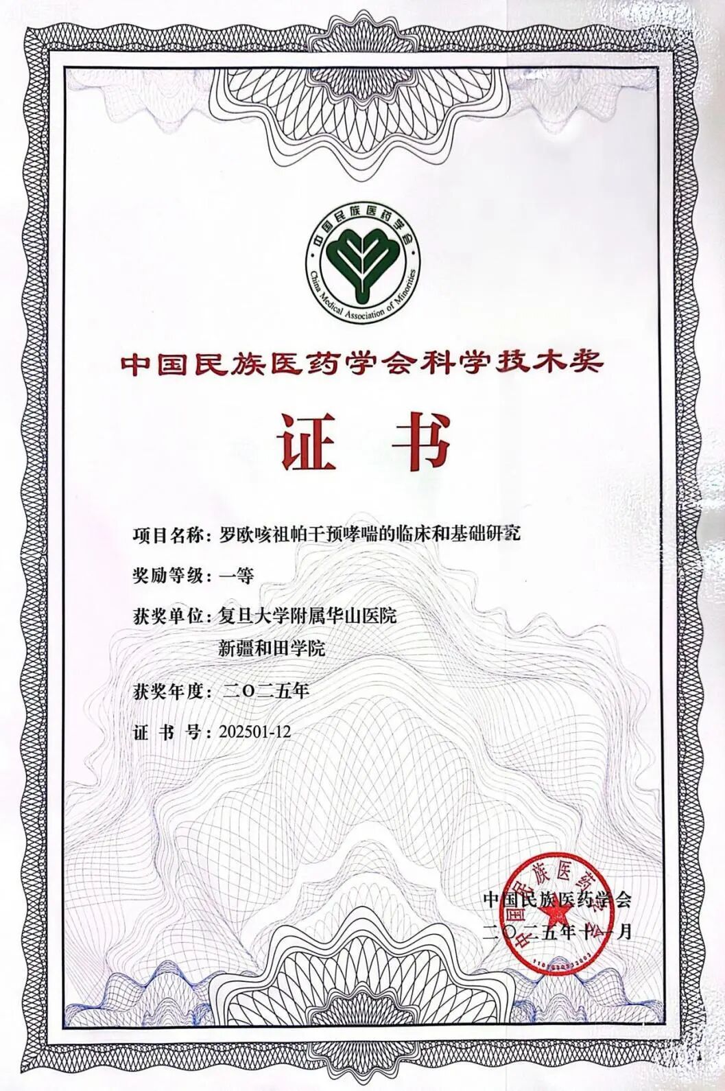2025年12月7日,中国民族医药学会第四届理事会第五次会议在江苏连云港隆重召开。会议期间举行了2025年度中国民族医药学会科学技术奖颁奖仪式,我院董竞成教授领衔团队的项目《罗欧咳祖帕干预哮喘的临床和基础研究》荣获一等奖。这一殊荣不仅是对团队在民族医药传承与创新领域杰出贡献的高度肯定,也标志着我院在中医药现代化研究方面取得重大突破。