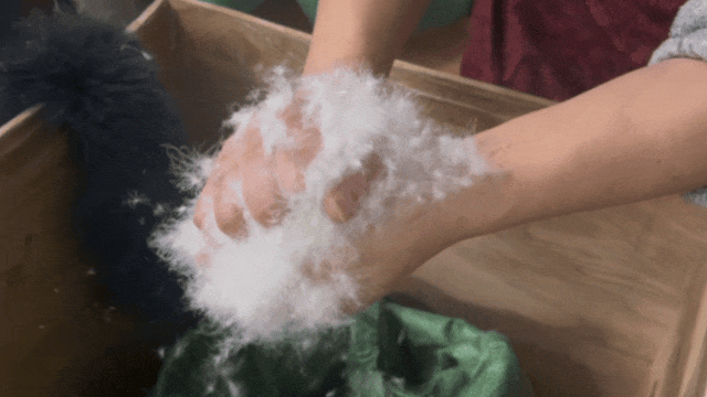 以旧换新的魔法,就藏在这台全自动充绒机器里。陈女士一边操作机器一边向记者介绍翻新的流程:“我们会手动把客人带来的羽绒服里的羽绒拆出来,拆出来的羽绒首先在机器里进行除尘、蓬松和过滤,只保留质量高的绒。”经过筛选过的羽绒再经过杀菌、消毒,最后输入充绒的重量,机器就会进行自动填充。