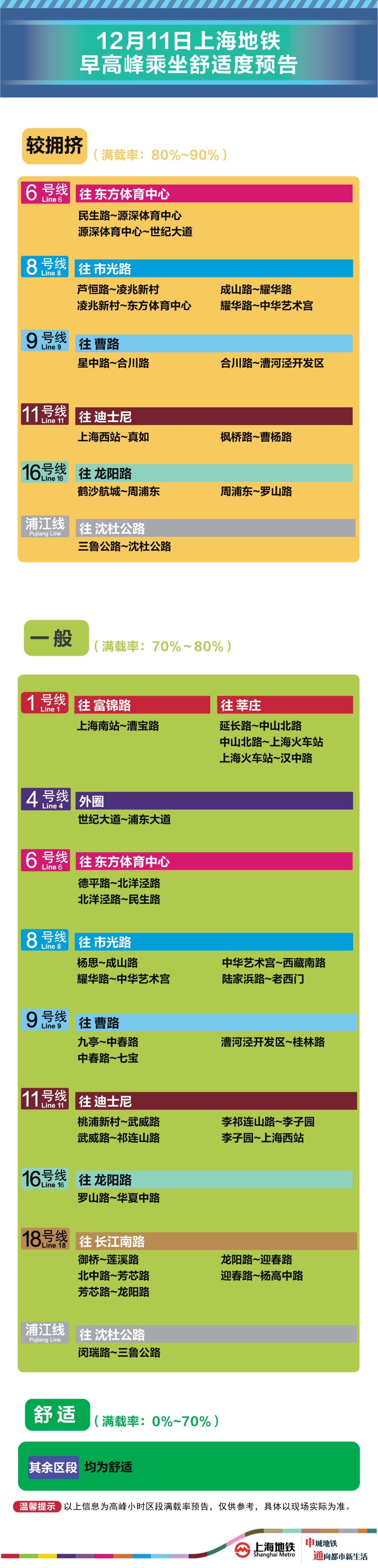 为提升上海地铁早高峰期间出行服务水平,提升乘客乘坐体验,上海地铁向乘客提供乘坐舒适度预告,方便乘客提前做好出行准备。