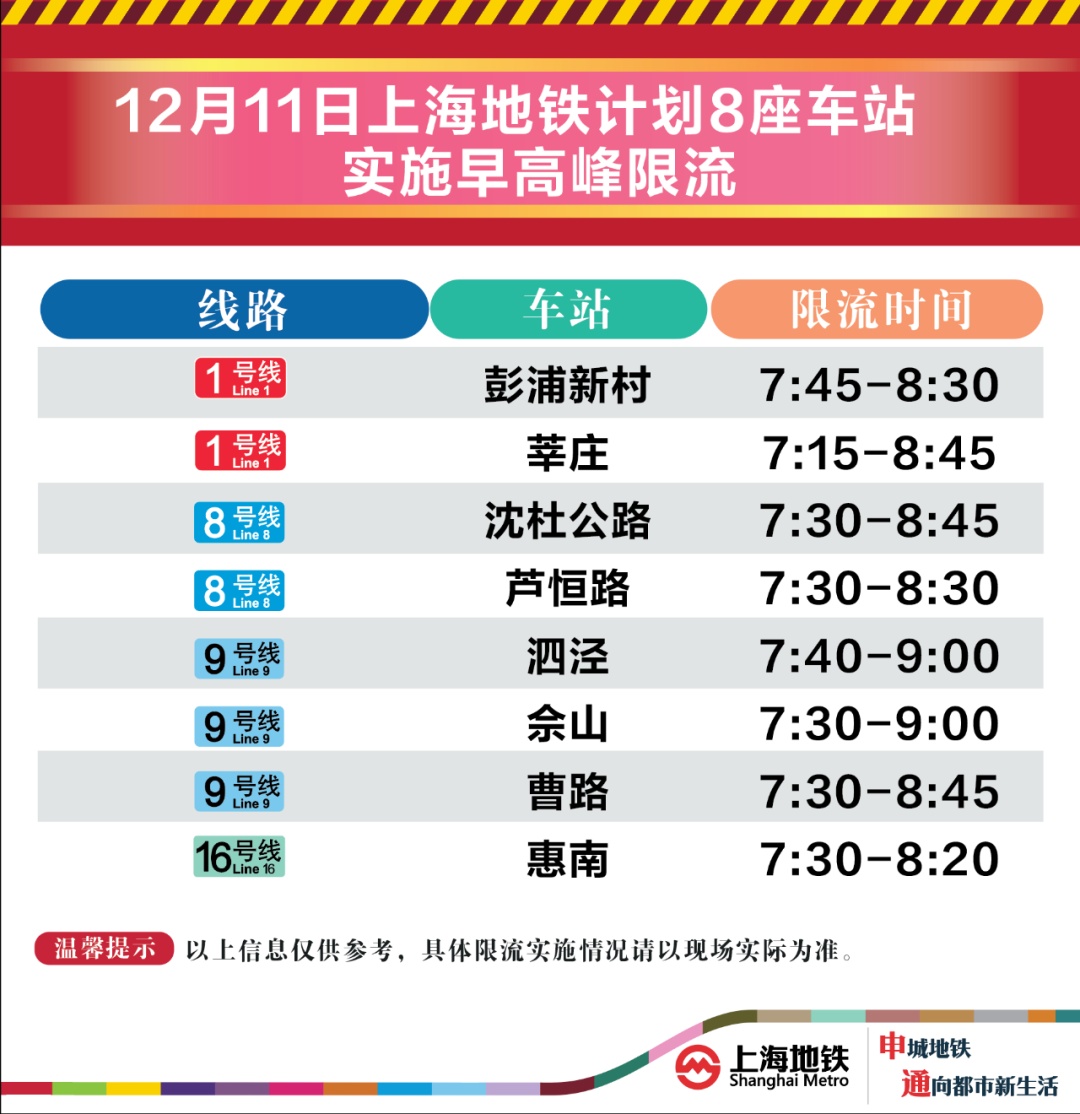 【编辑】倪炜12月11日,上海地铁早高峰限流措施将继续实施,届时将有8座地铁站早高峰计划限流。为提升上海地铁早高峰期间出行服务水平,提升乘客乘坐体验,上海地铁向乘客提供乘坐舒适度预告,方便乘客提前做好出行准备。