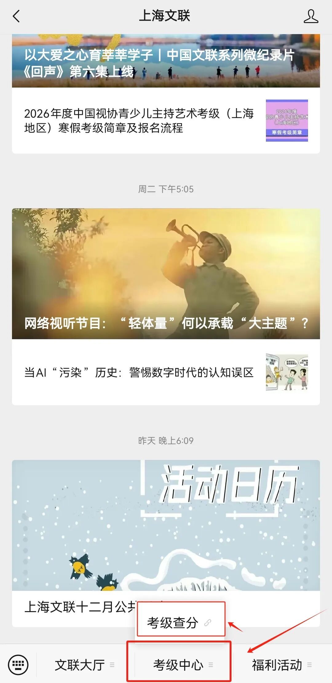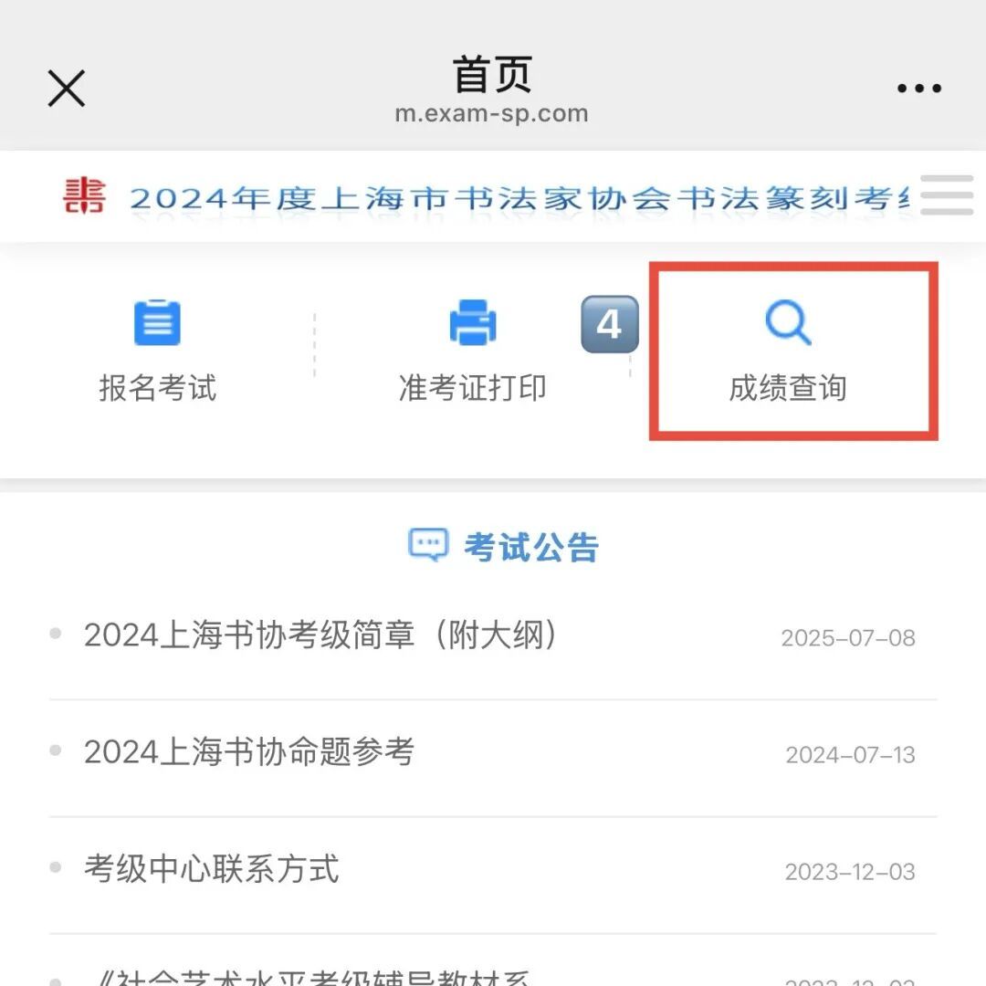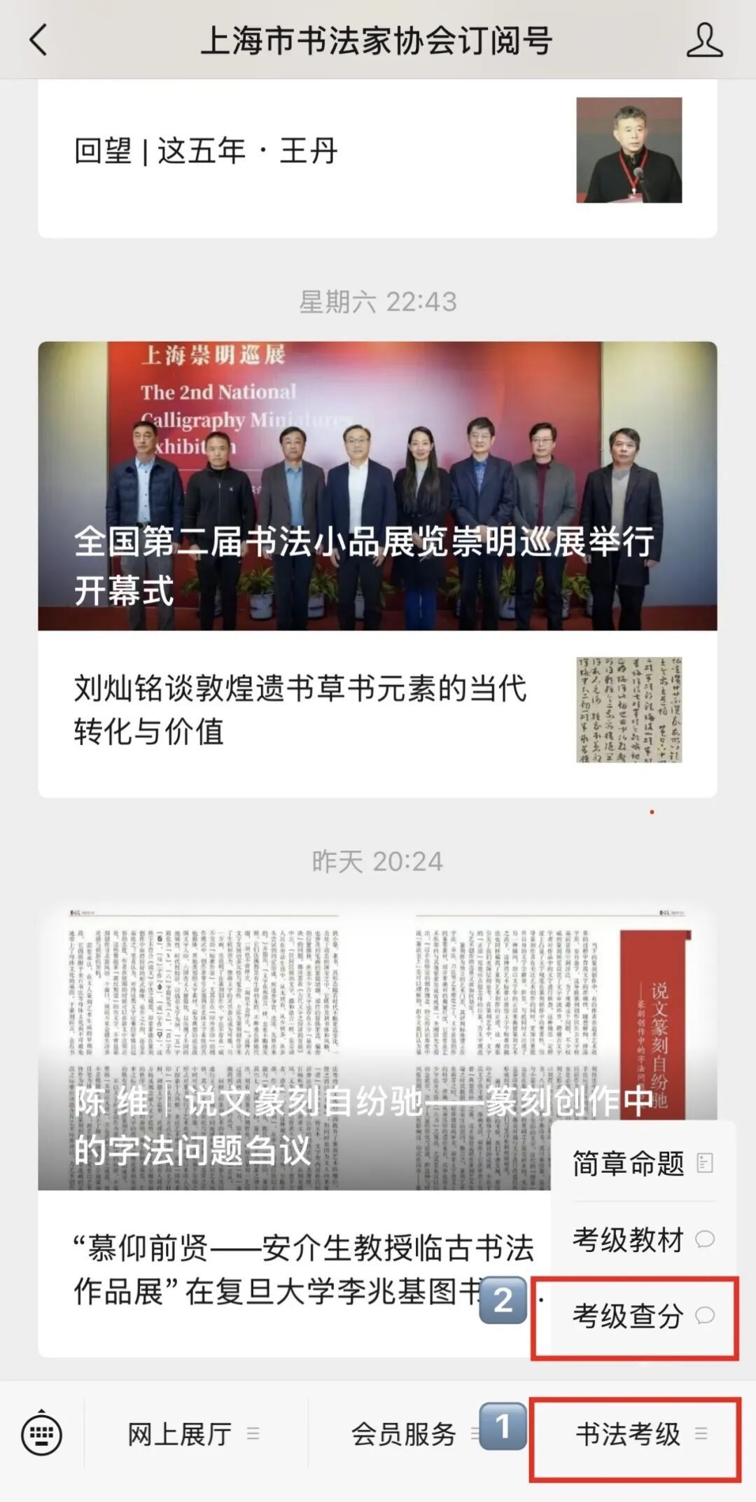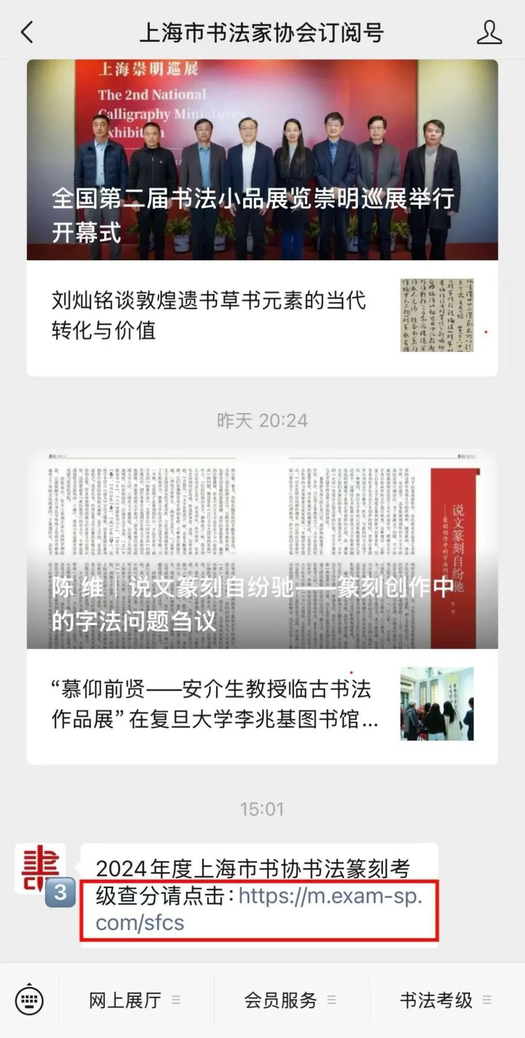 2024年度上海市书法家协会书法篆刻考级评分工作已结束,即日起考生可登录“上海文联”、“上海市书法家协会订阅号”及“上海文艺事业发展中心”微信公众号查询成绩,具体操作如下: