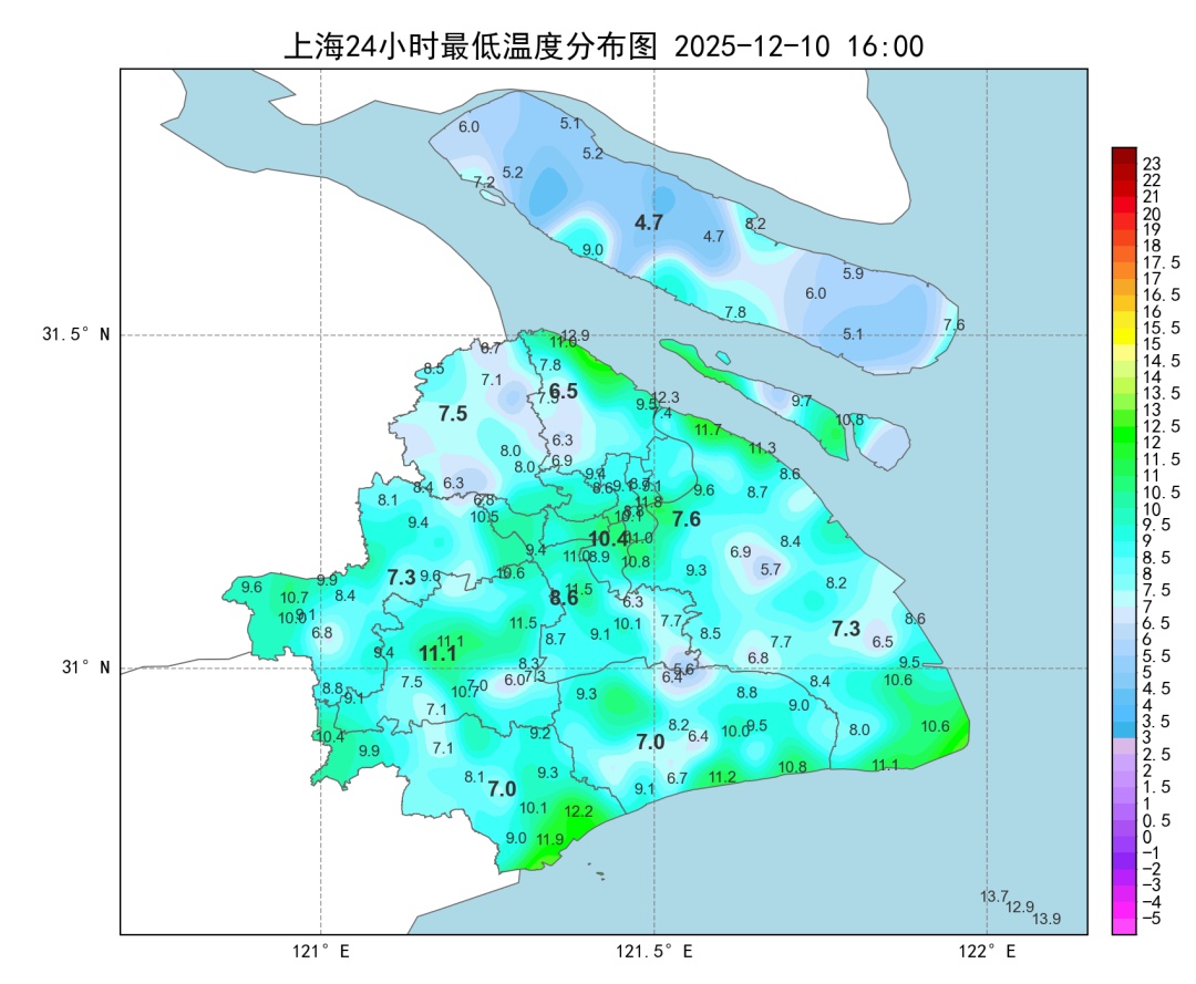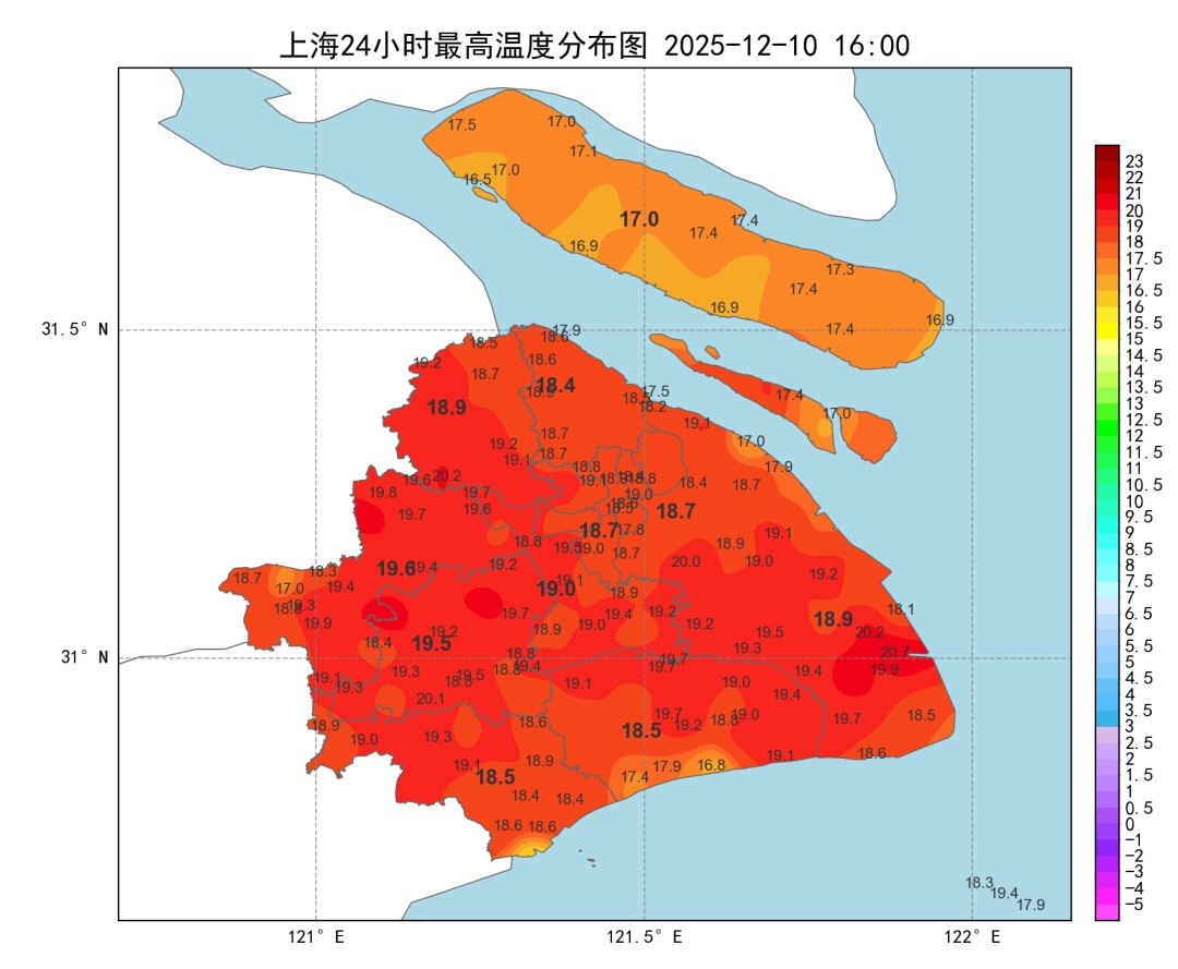 随着暖湿气流加强,今天的气温较昨日回升。早晨全市最低气温大多在6~10℃之间,市区徐家汇站10.4℃,崇明4.7℃为最低。上午多云到阴,阳光稍有露脸,全市最高气温升至18~20℃之间,市区徐家汇站18.7℃。受短波槽东移影响,下午转阴到多云,半夜以前,局部地区可能会飘一些短时小雨。