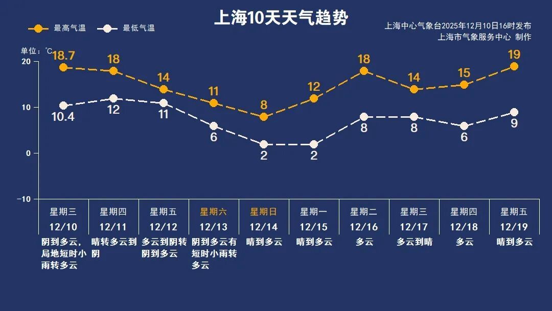 周五后期受弱冷空气扩散影响,云系增多,最高气温降至14℃附近。周六本市有一次强冷空气过程,将出现明显大风降温,并伴有弱降水。预计本次冷空气过程中心城区最低气温降至2℃左右,郊区零下4℃到零下1℃,有薄冰或冰冻。周日气温将创今年下半年新低,全天仅2~8℃。不过,此轮寒潮过程持续时间较短,下周一白天起就会逐渐回暖,下周二的最高气温又将升至18℃附近。未来十天,气温起伏较大,大家要根据天气变化及时调整着装,谨防感冒。