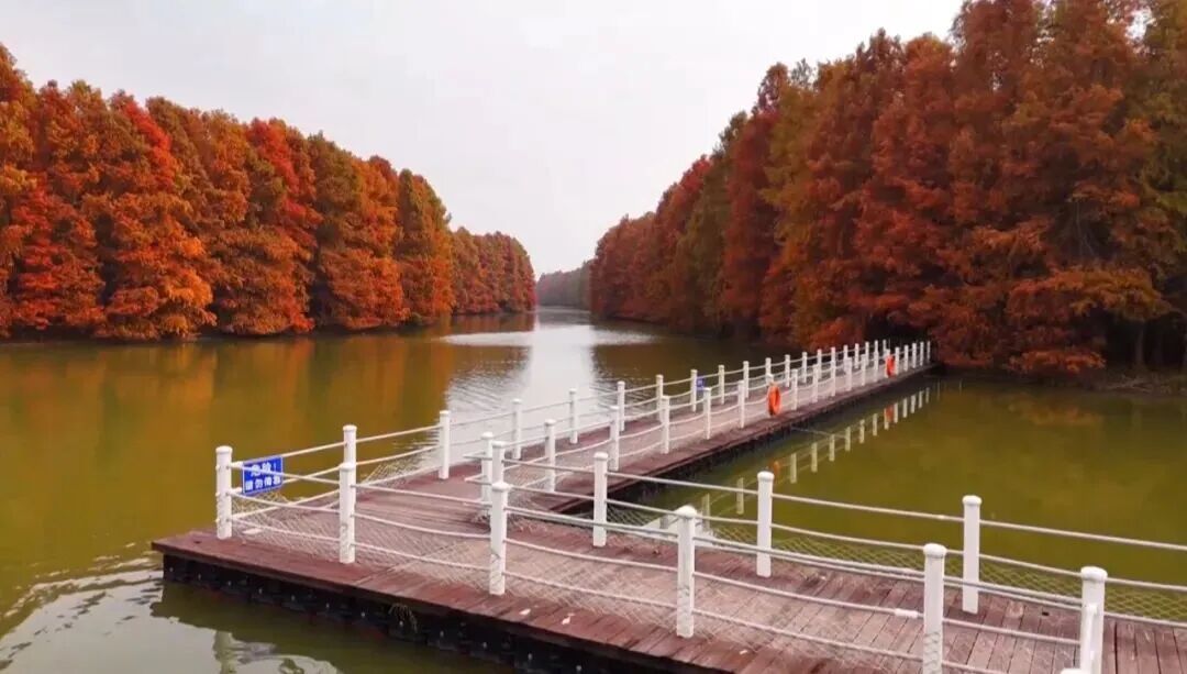 初冬的暖阳下,上海海湾国家森林公园的“调色盘”仿佛被瞬间打翻——20余万株杉树由绿转黄,再浸染为深红与赭红色,构成一幅绵延壮阔的立体油画。这片距离市区仅约一小时车程的森林,已进入一年中最绚烂的时刻。