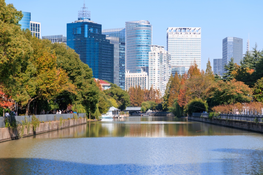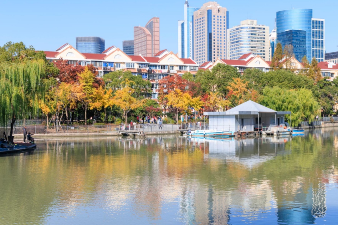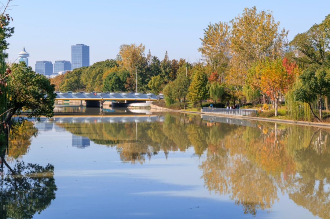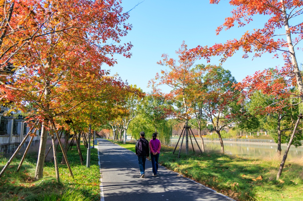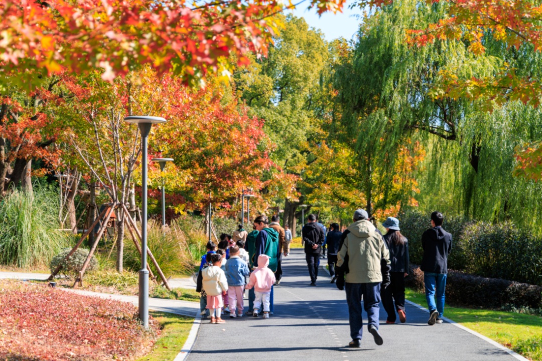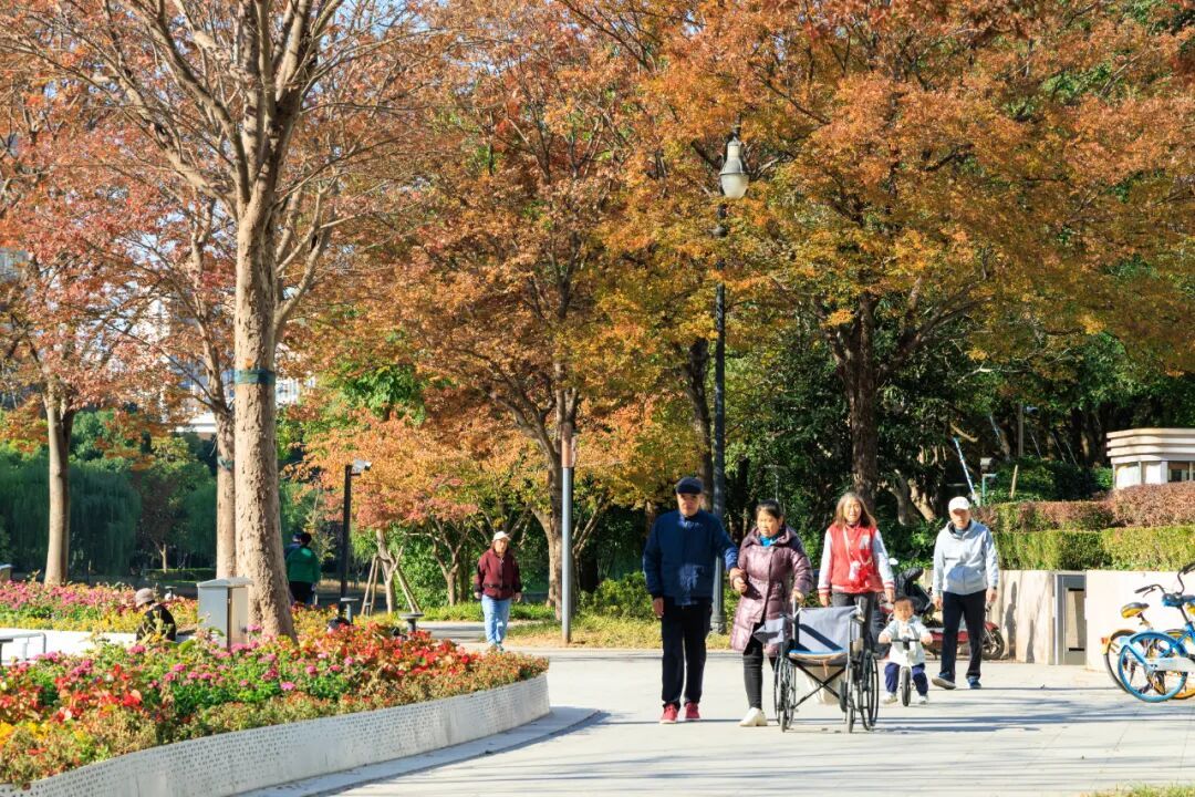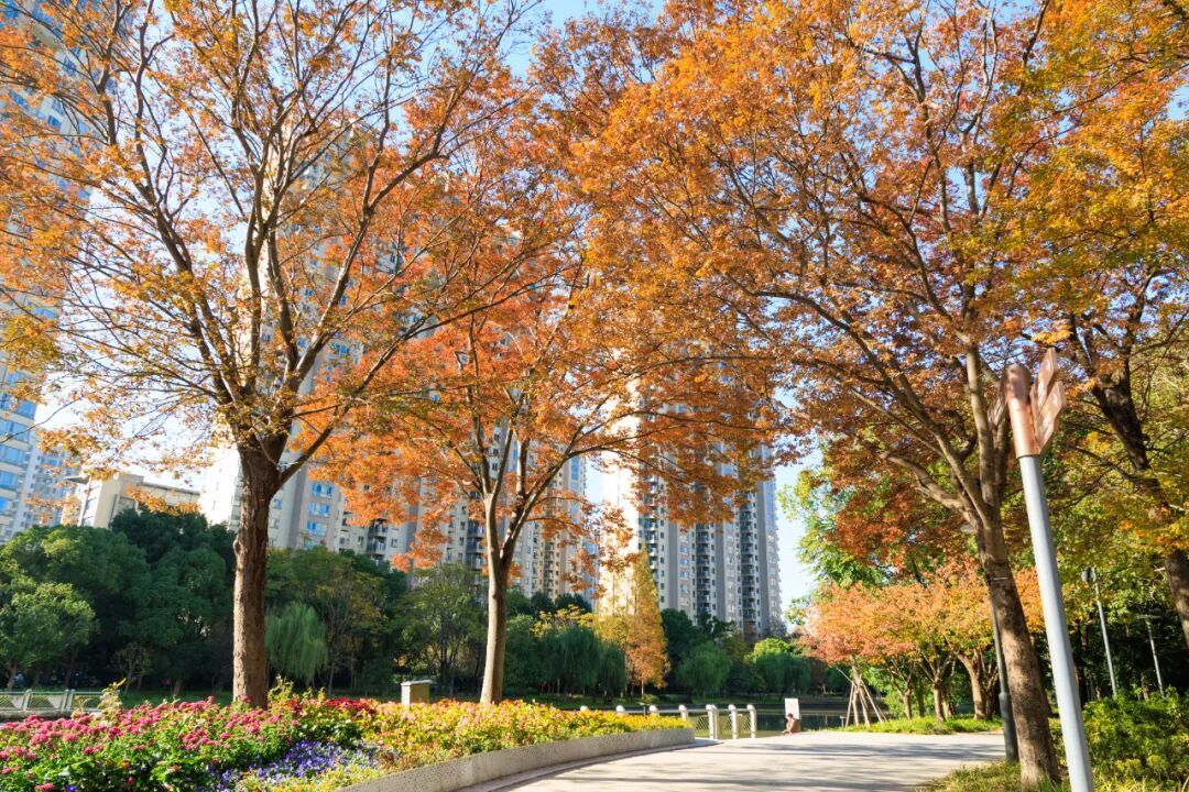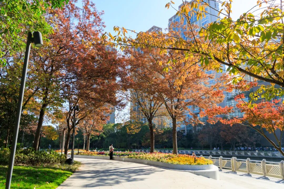 水杉以它特有的谦逊姿态站立在陆家嘴水环两岸。它们褪去了夏日的青翠,披上古铜色的外衣,挺拔的身影在水中拉长出淡淡的影子。这些沉静的守望者,用自己含蓄的色彩,恰到好处地衬托着娜塔栎的热烈。