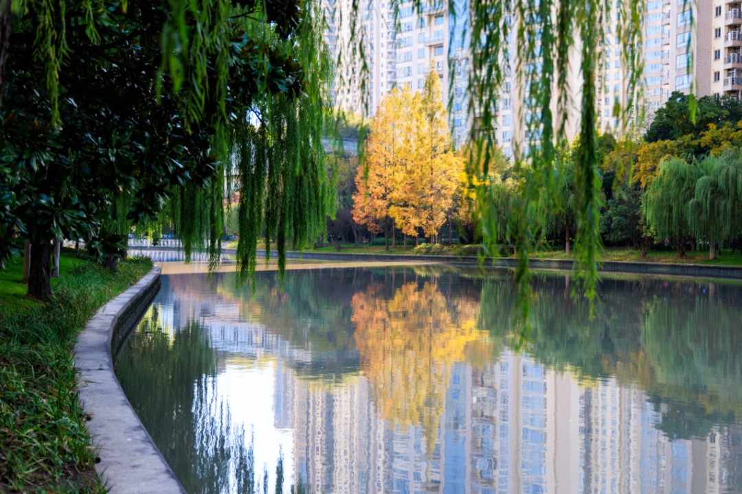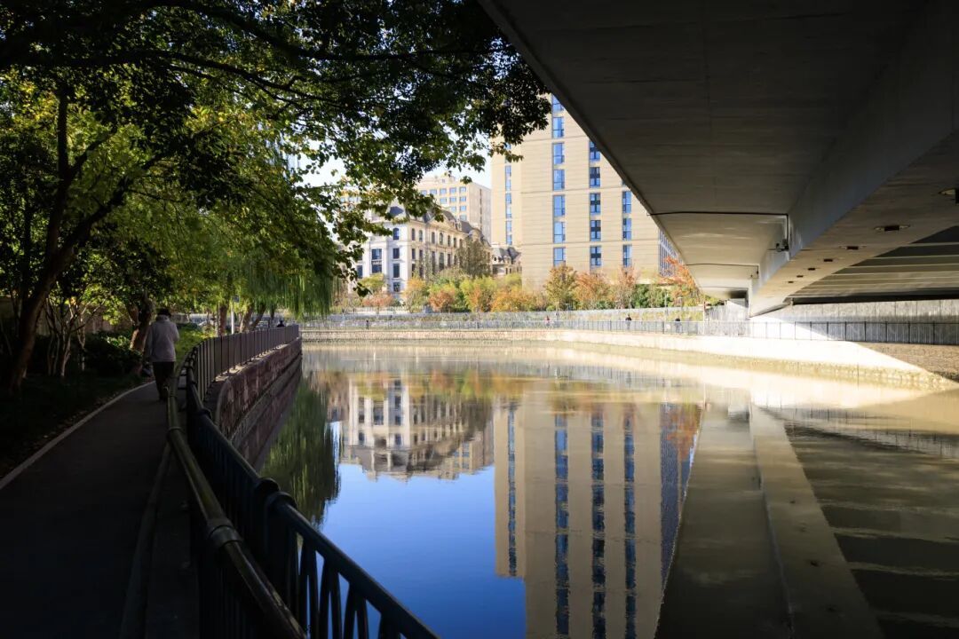 午后的光变得醇厚,将建筑群的轮廓、树木的枝桠与粼粼水光编织在一起。现代都市的刚硬线条,在此刻被自然柔软的笔触化解。你听见的,只有风吹过树梢的簌簌声,以及水流轻抚岸边的呢喃。这以娜塔栎为主角的景色,既热烈又短暂。它提醒着我们:最美的风景,或许就藏在我们日常经过的水岸,在那一片红叶与光影的交织之中。