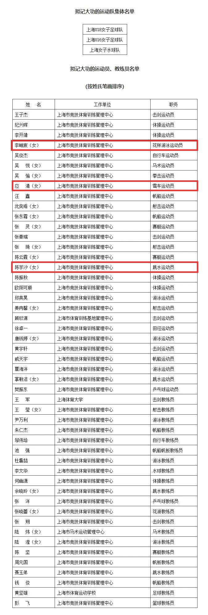 根据上海市人社局近日发布的公示,为表彰在第十五届全国运动会与第十四届全国冬季运动会中表现突出的上海运动员和教练员,经相关单位推荐并综合评审,初步确定3个集体和49名个人为记大功对象。徐汇区跳水运动员陈芋汐、花样游泳运动员李岫宸以及雪车运动员应清位列其中。 公示显示,在两项赛事中,上海运动员展现了顽强拼搏、团结协作的精神,圆满完成参赛任务,为上海赢得了荣誉。本次评选依据《事业单位工作人员奖励规定》及《上海市事业单位工作人员奖励实施细则》,由市人社局会同市体育局、市教委共同组织开展,致力于奖励在赛事中作出突出贡献的运动员与教练员。 表彰名单 记者:张旺 编辑:罗时珎 转载请注明来自上海徐汇官方账号