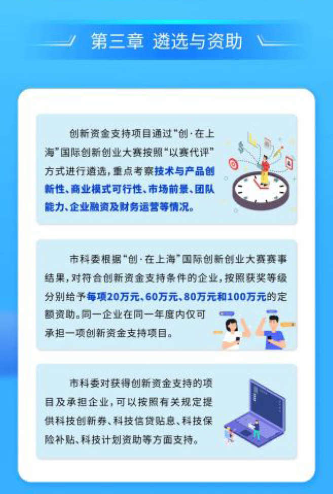 (三)提升资金扶持额度。实行分级资助机制,根据“创?在上海”国际创新创业大赛赛事结果,对符合创新资金支持条件的企业,按照获奖等级分别给予每项20至100万元的定额资助。