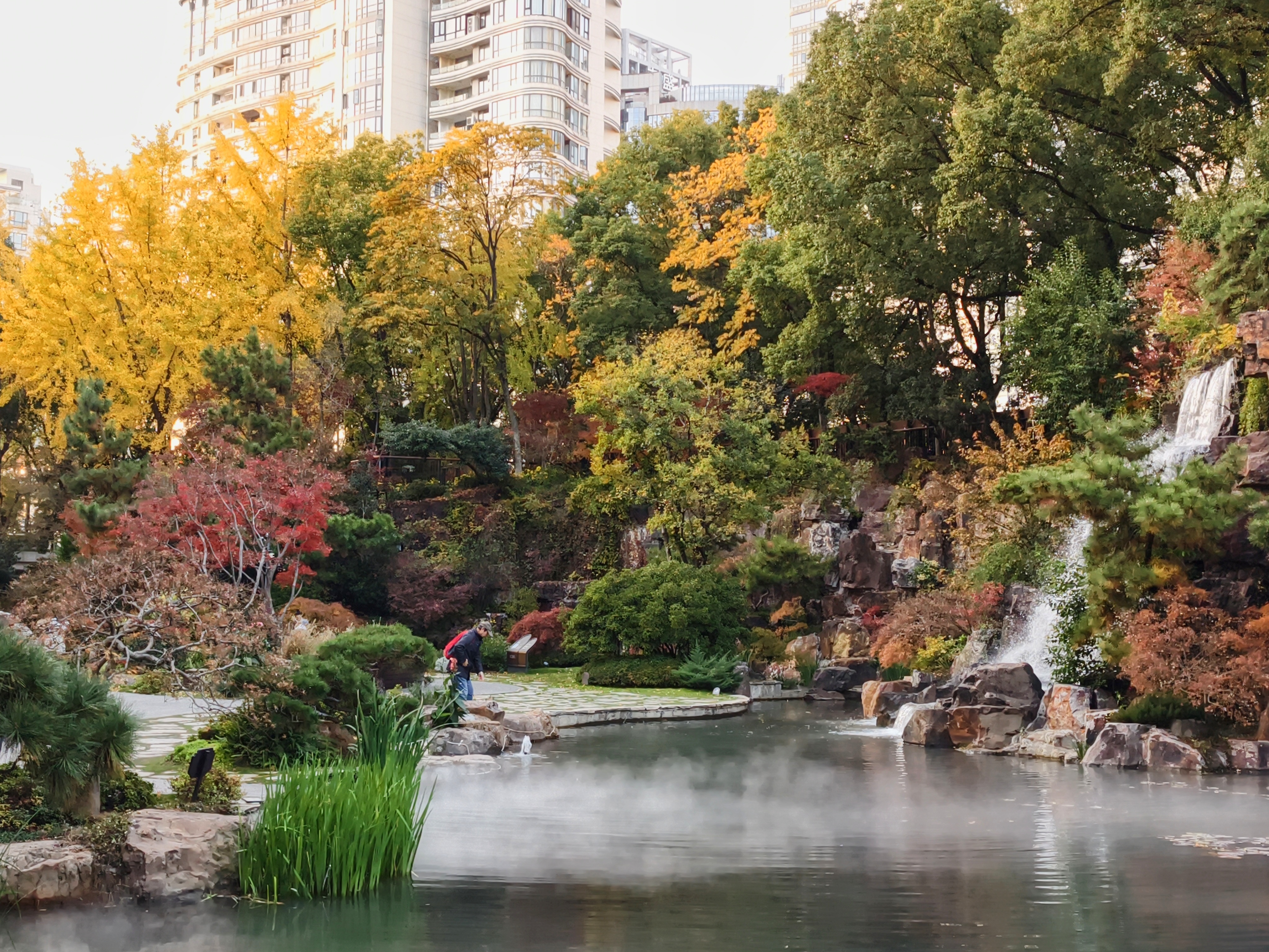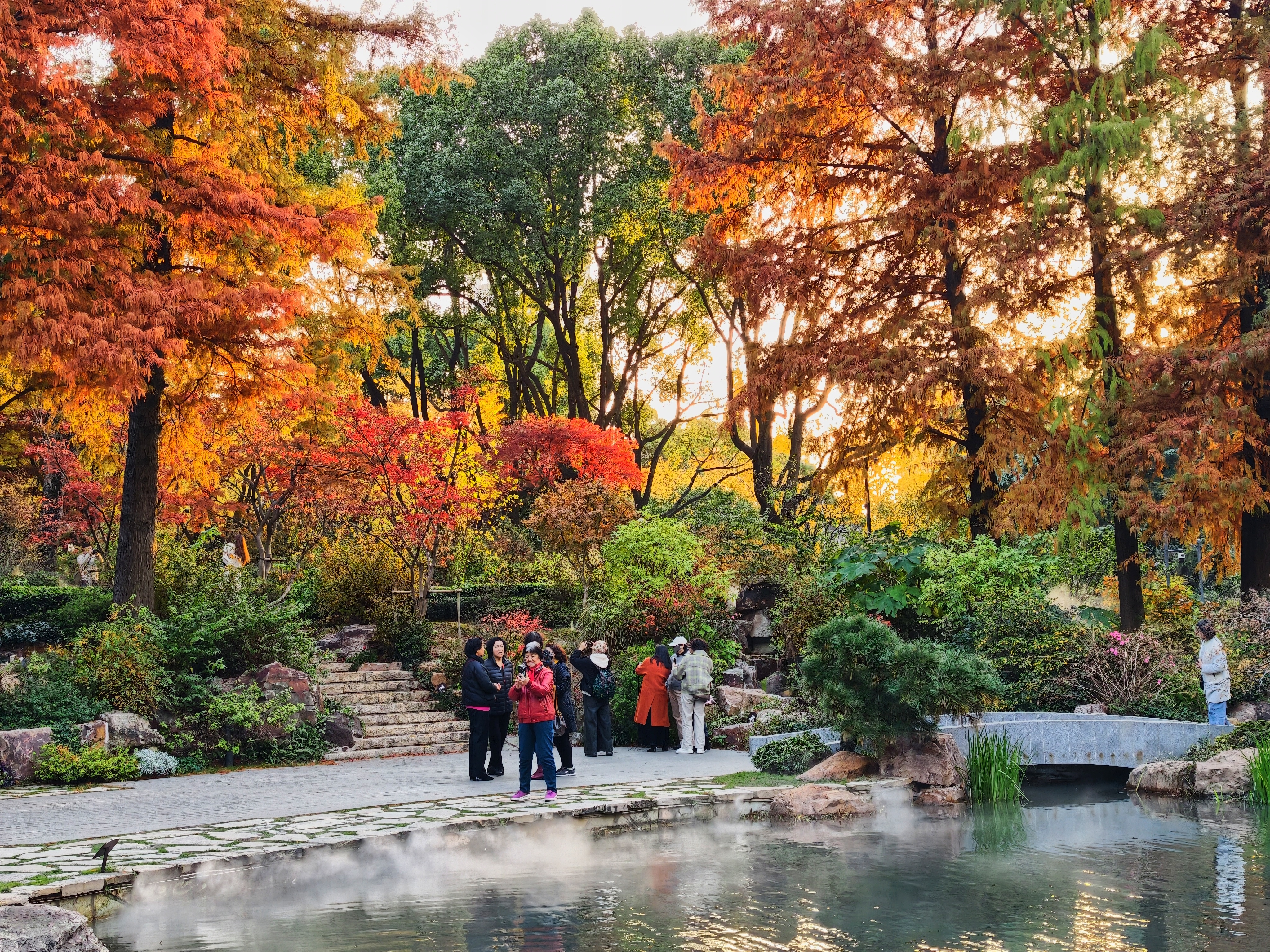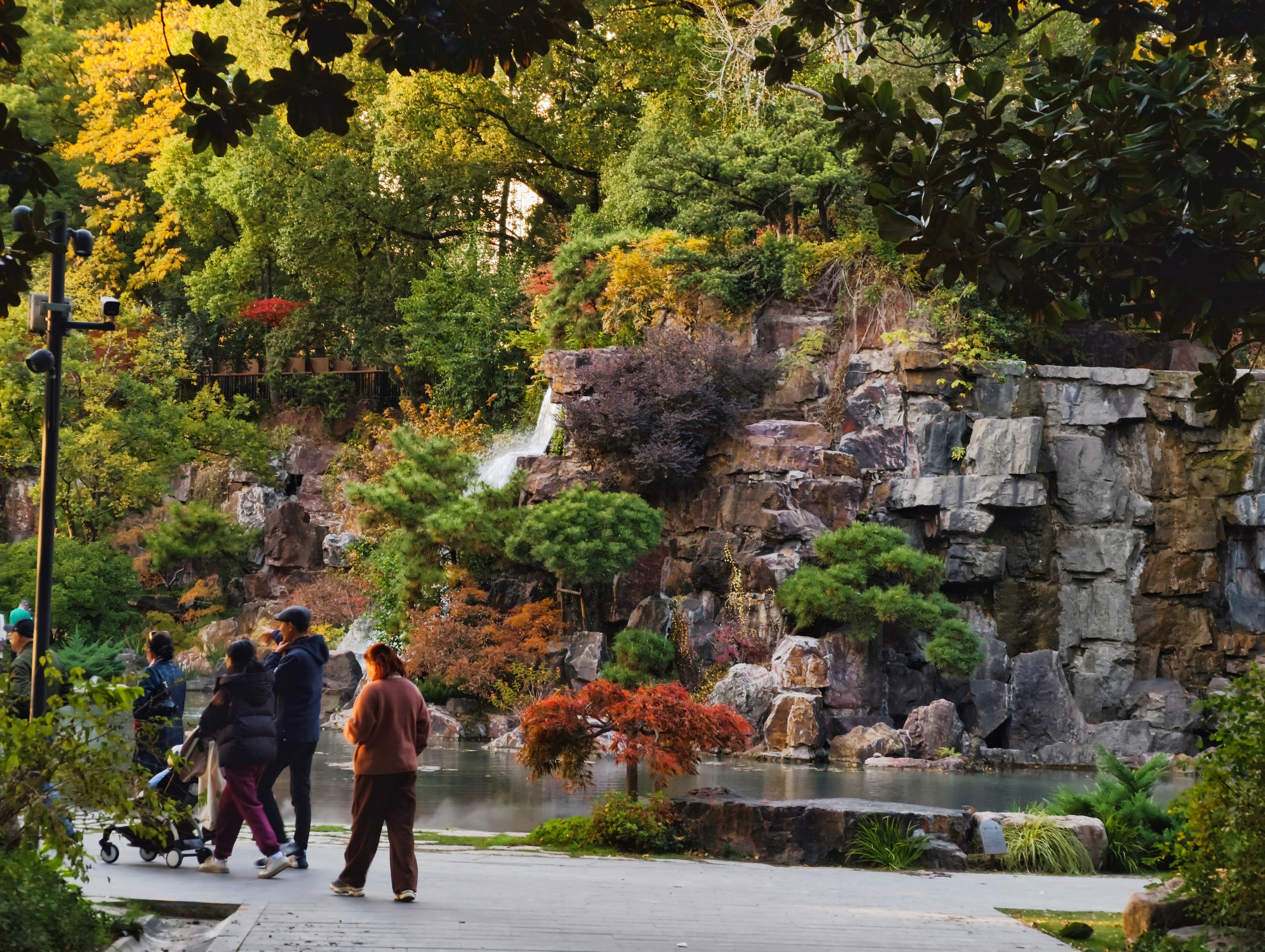 假山叠瀑处,仍是园内最具人气的所在。水流潺潺,林间氤氲起水雾,让周围的色彩愈发润泽通透。水声与光影交织,为这幅静态的秋日油画,注入了声音与流动的灵魂。