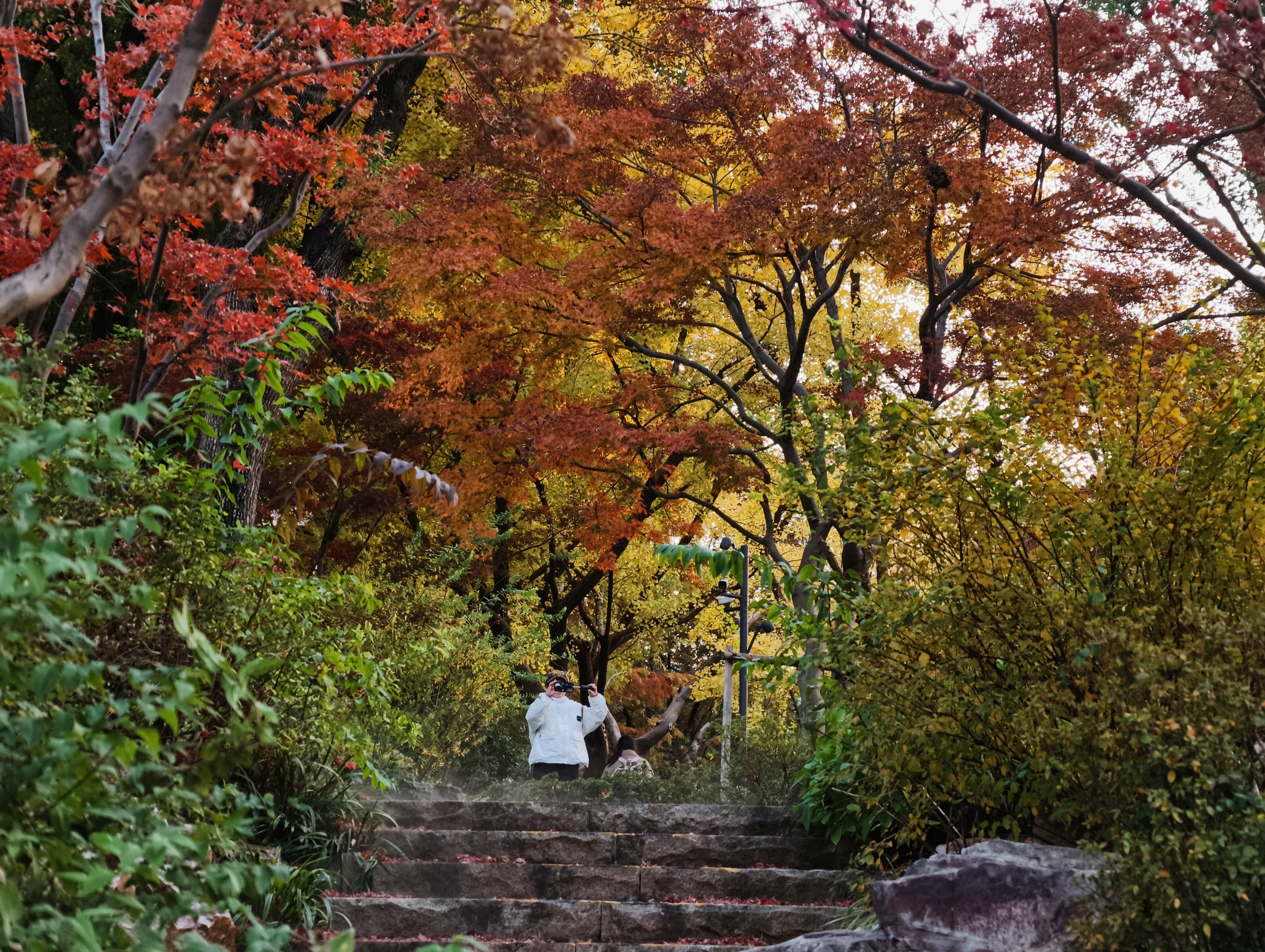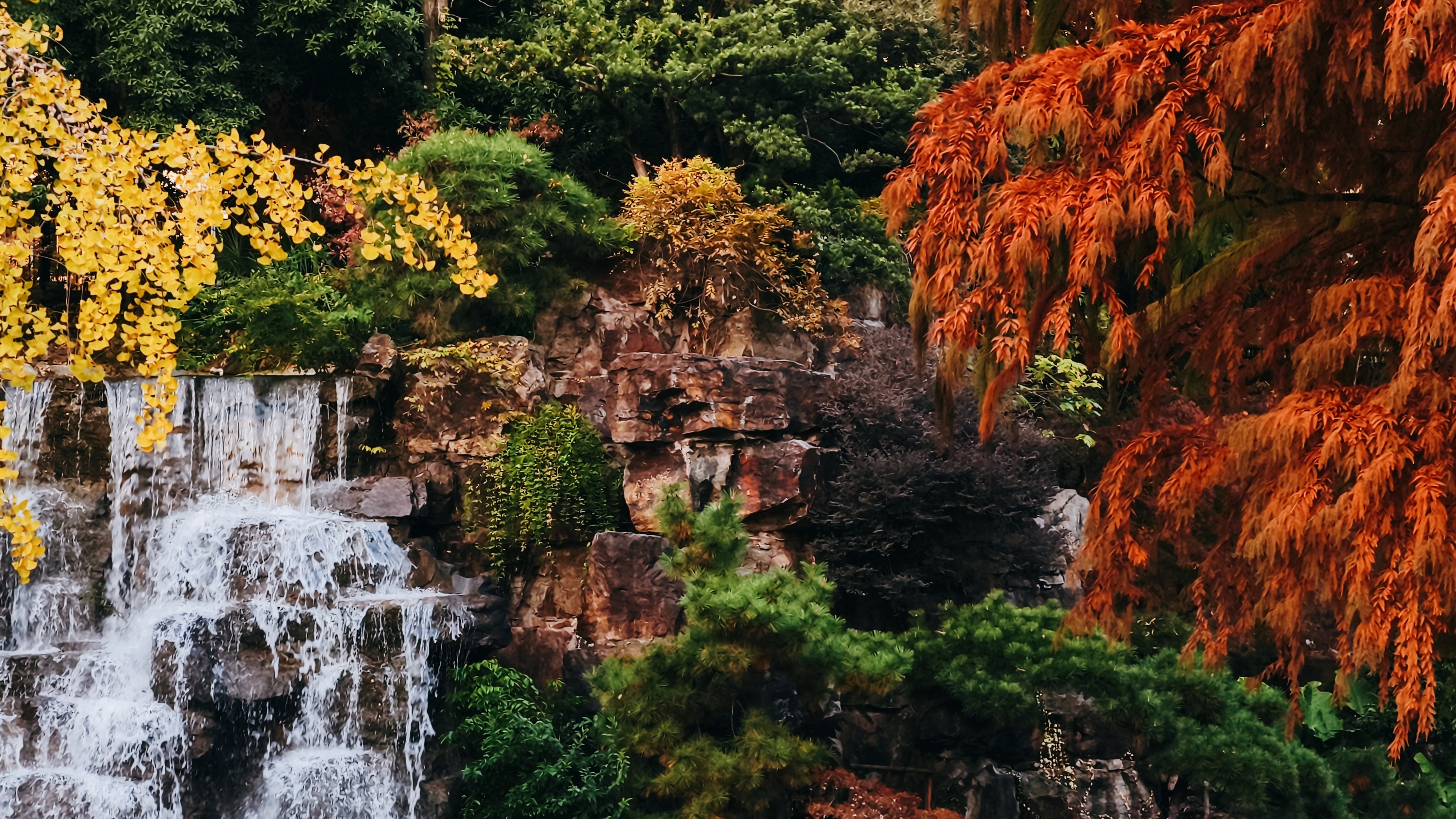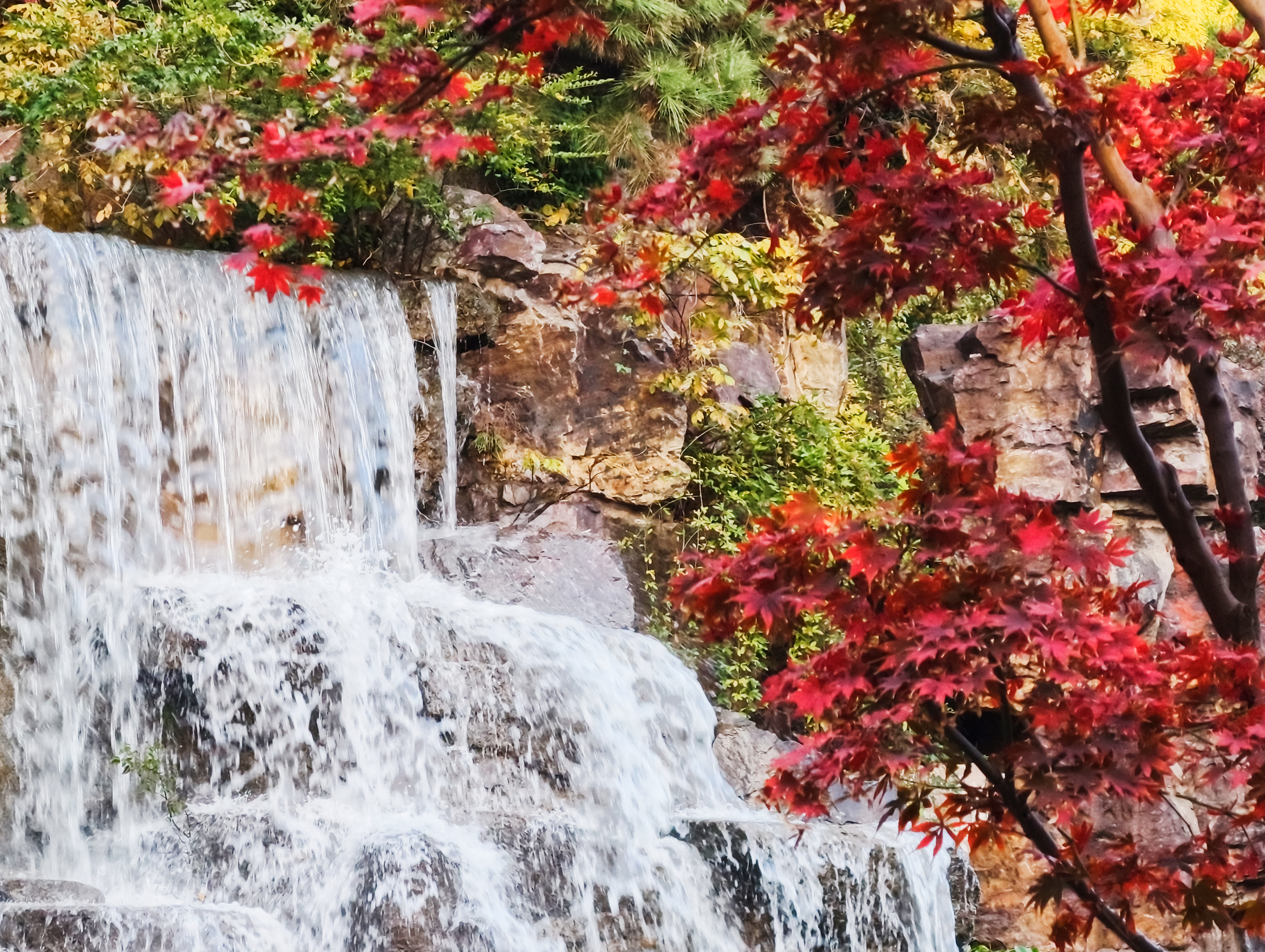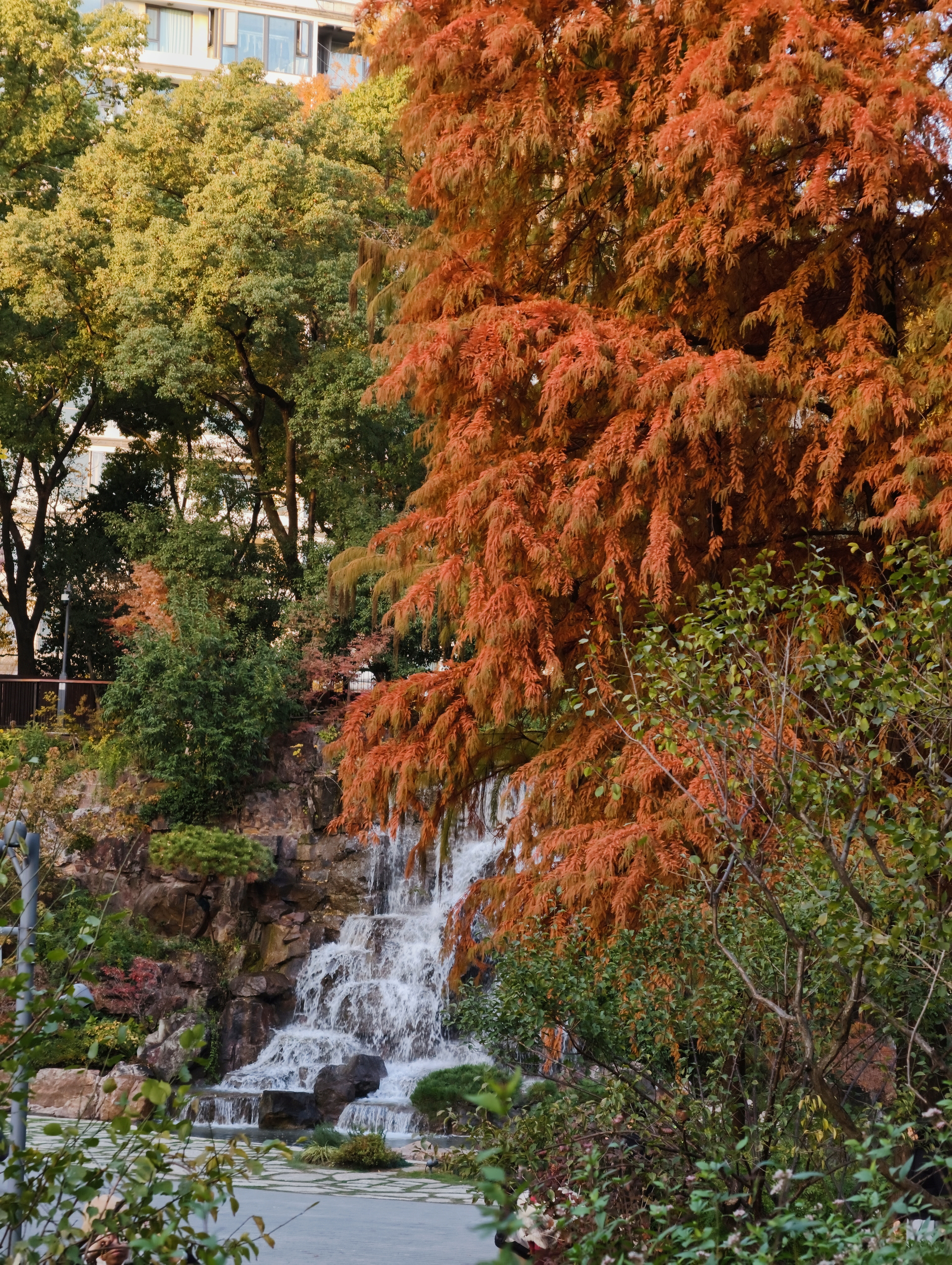 假山叠瀑处,仍是园内最具人气的所在。水流潺潺,林间氤氲起水雾,让周围的色彩愈发润泽通透。水声与光影交织,为这幅静态的秋日油画,注入了声音与流动的灵魂。