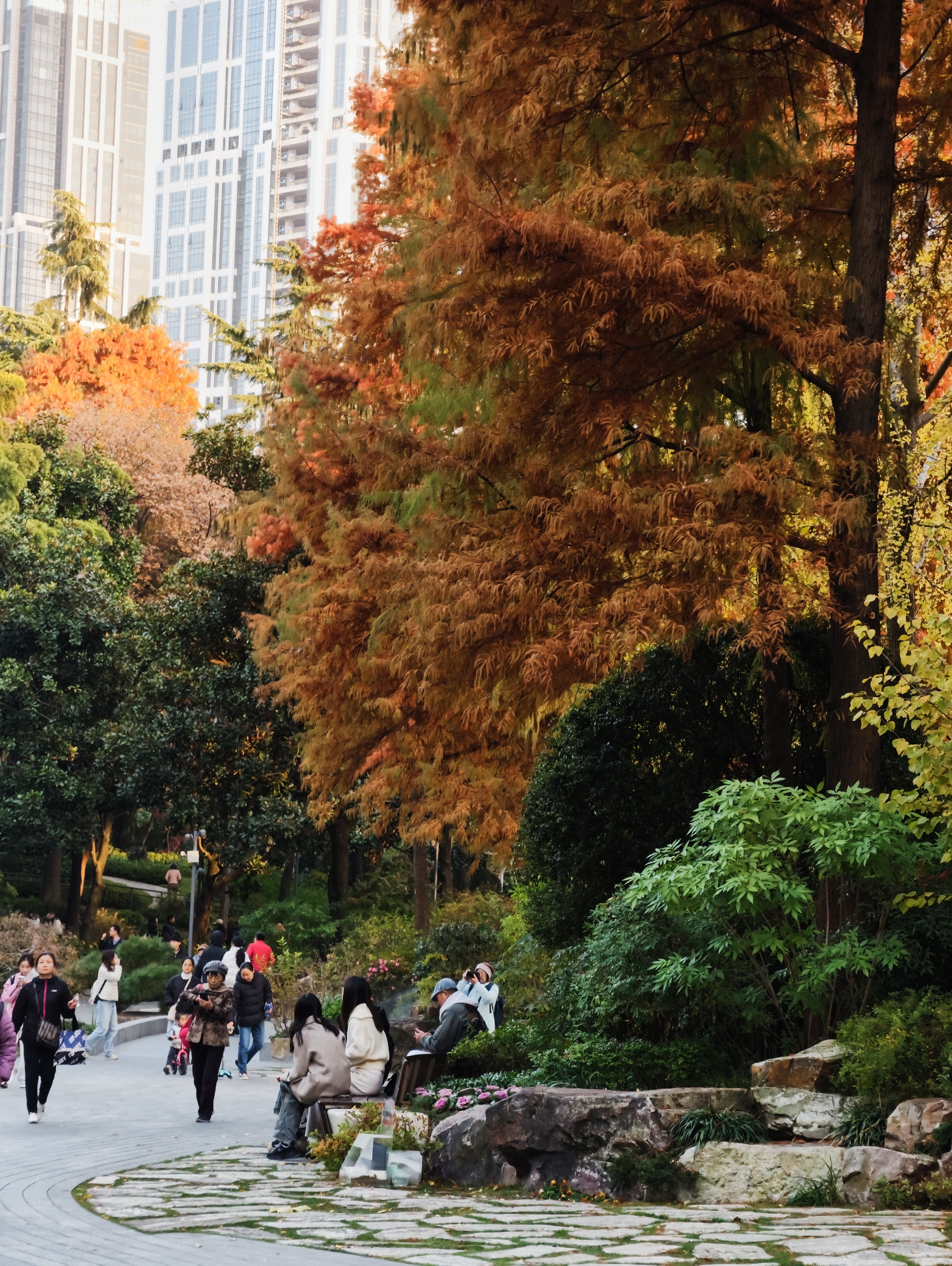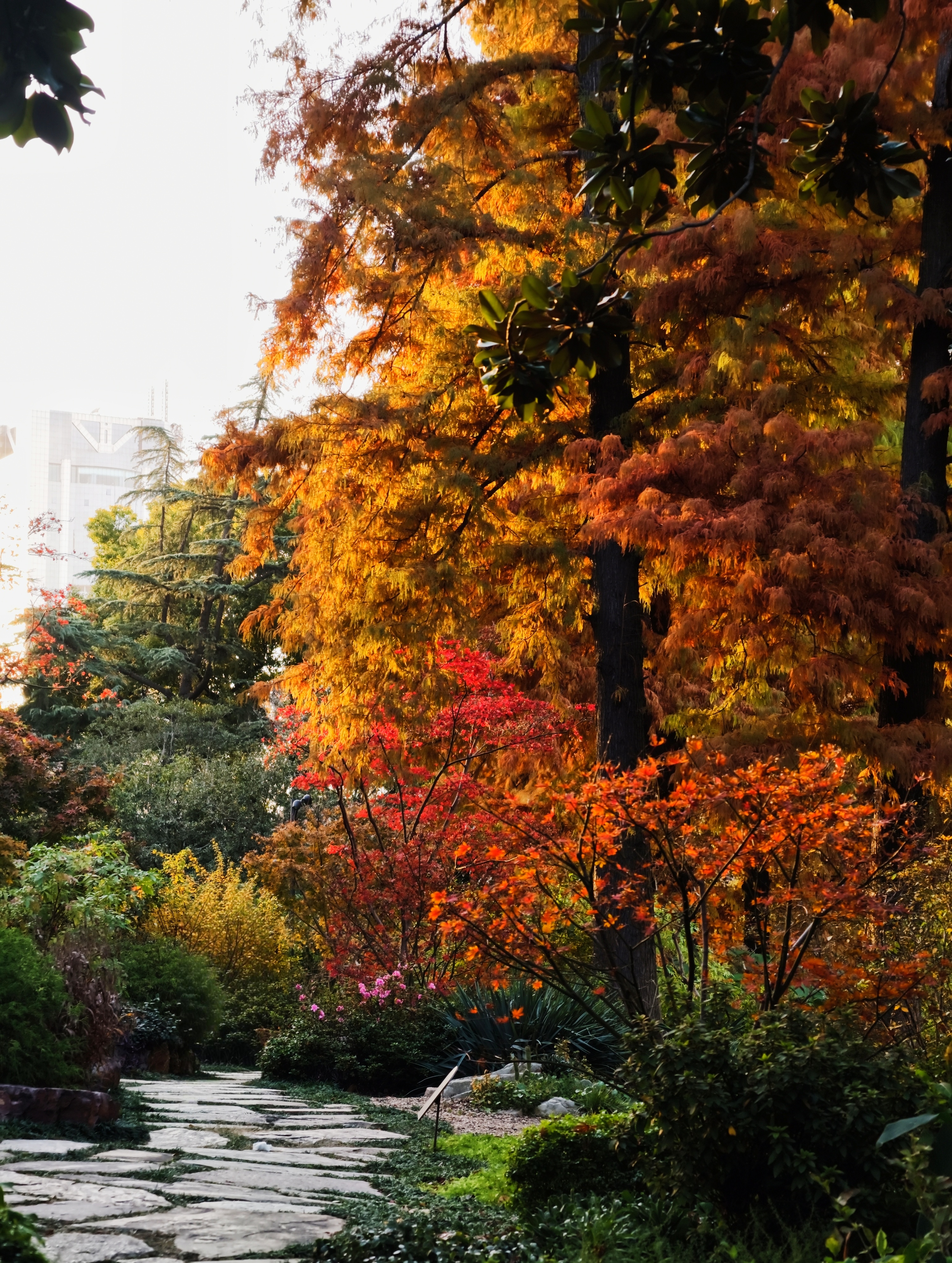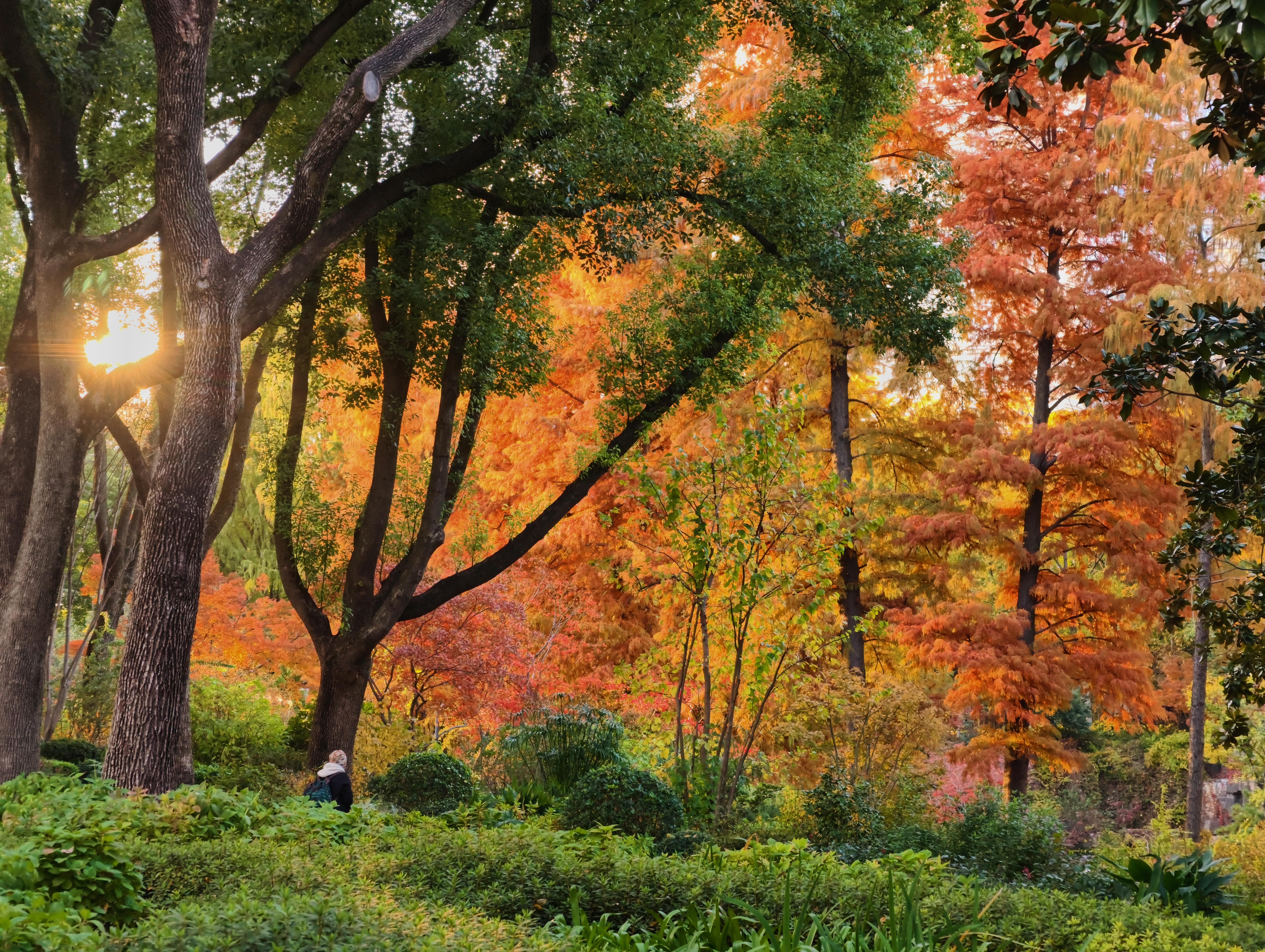 银杏洒下落日熔金般的灿黄,红枫点燃一簇簇火焰,落羽杉披上渐变的焦糖色外衣,与常绿树木的苍翠交织、叠加。