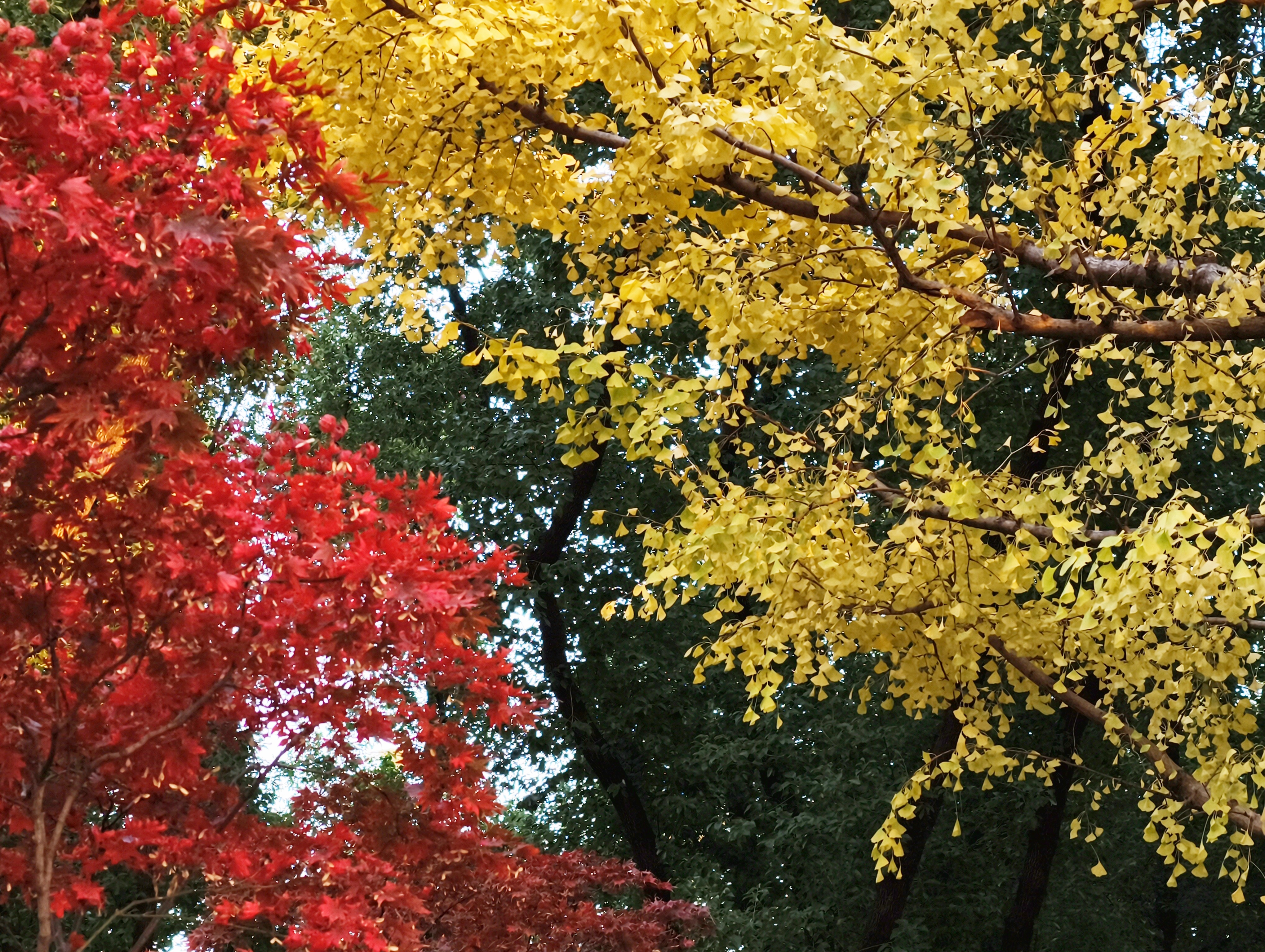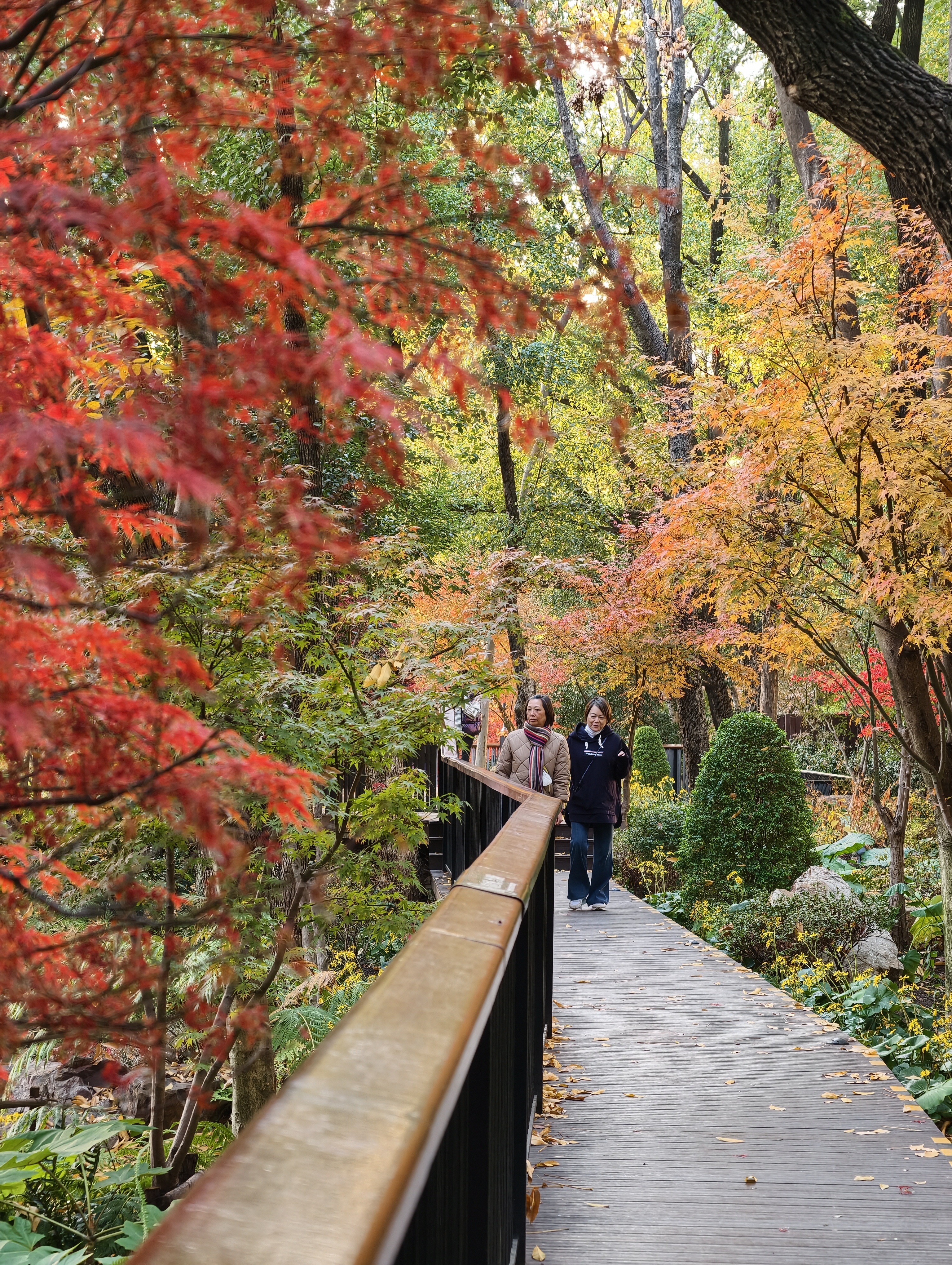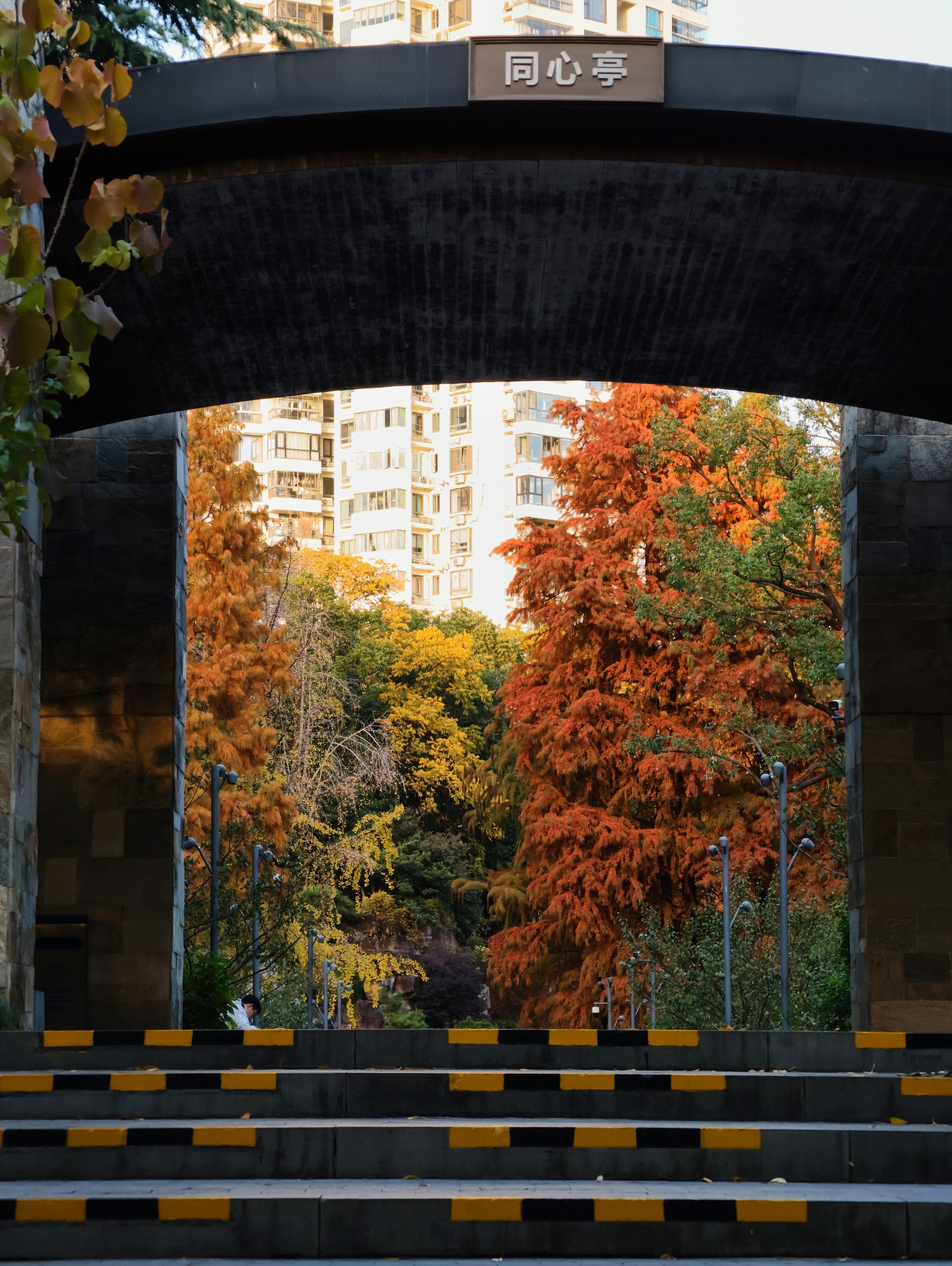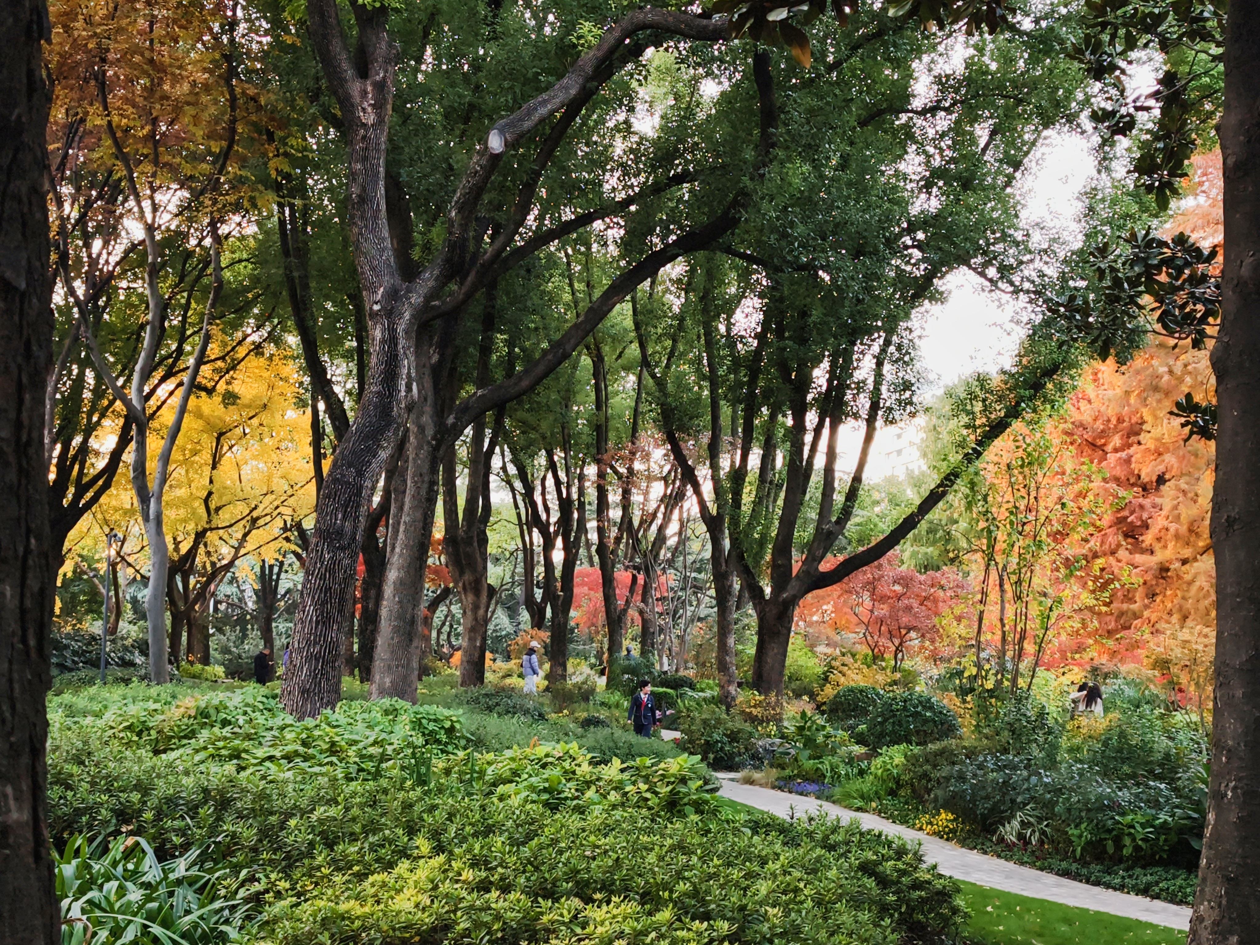 银杏洒下落日熔金般的灿黄,红枫点燃一簇簇火焰,落羽杉披上渐变的焦糖色外衣,与常绿树木的苍翠交织、叠加。