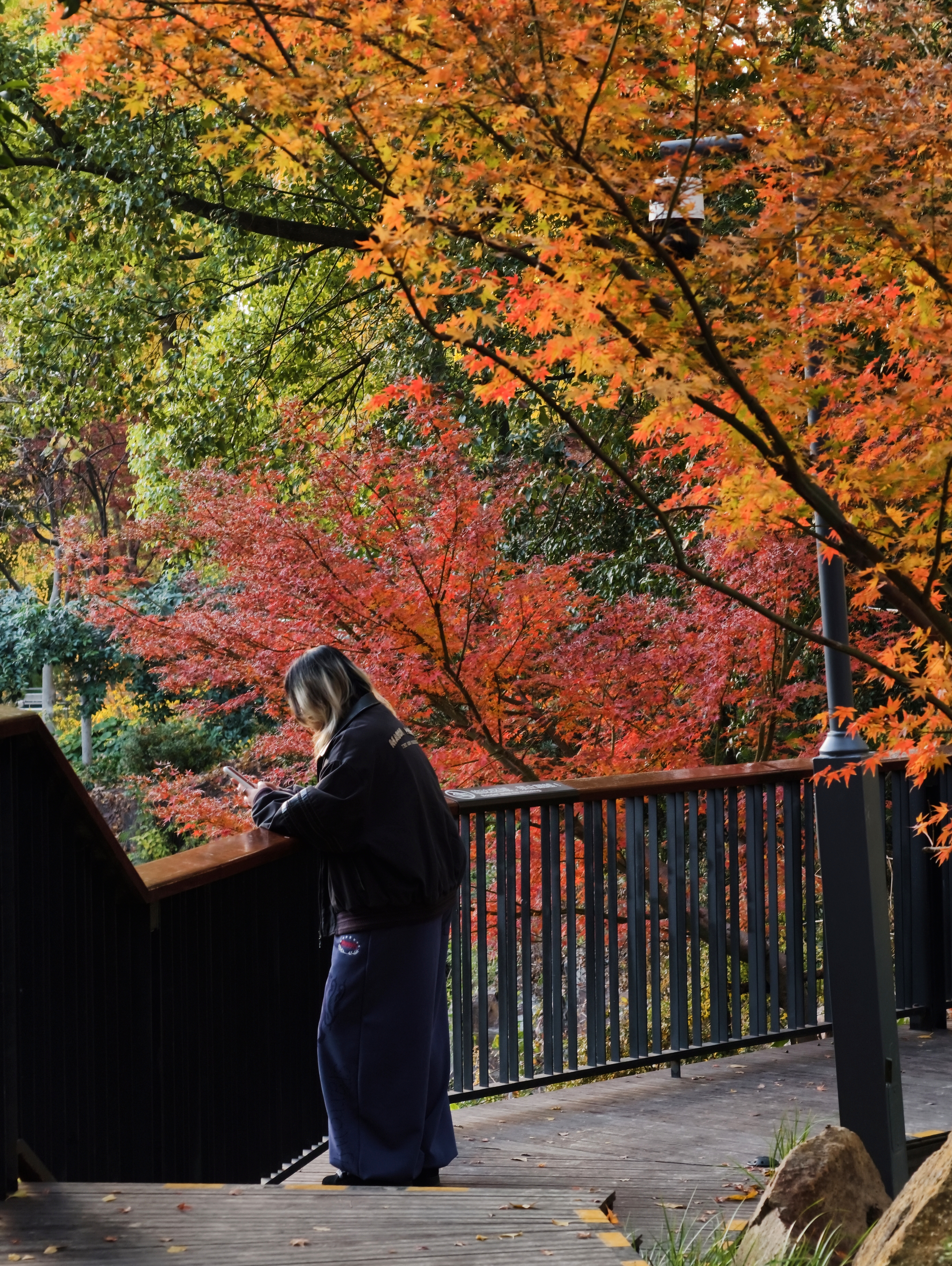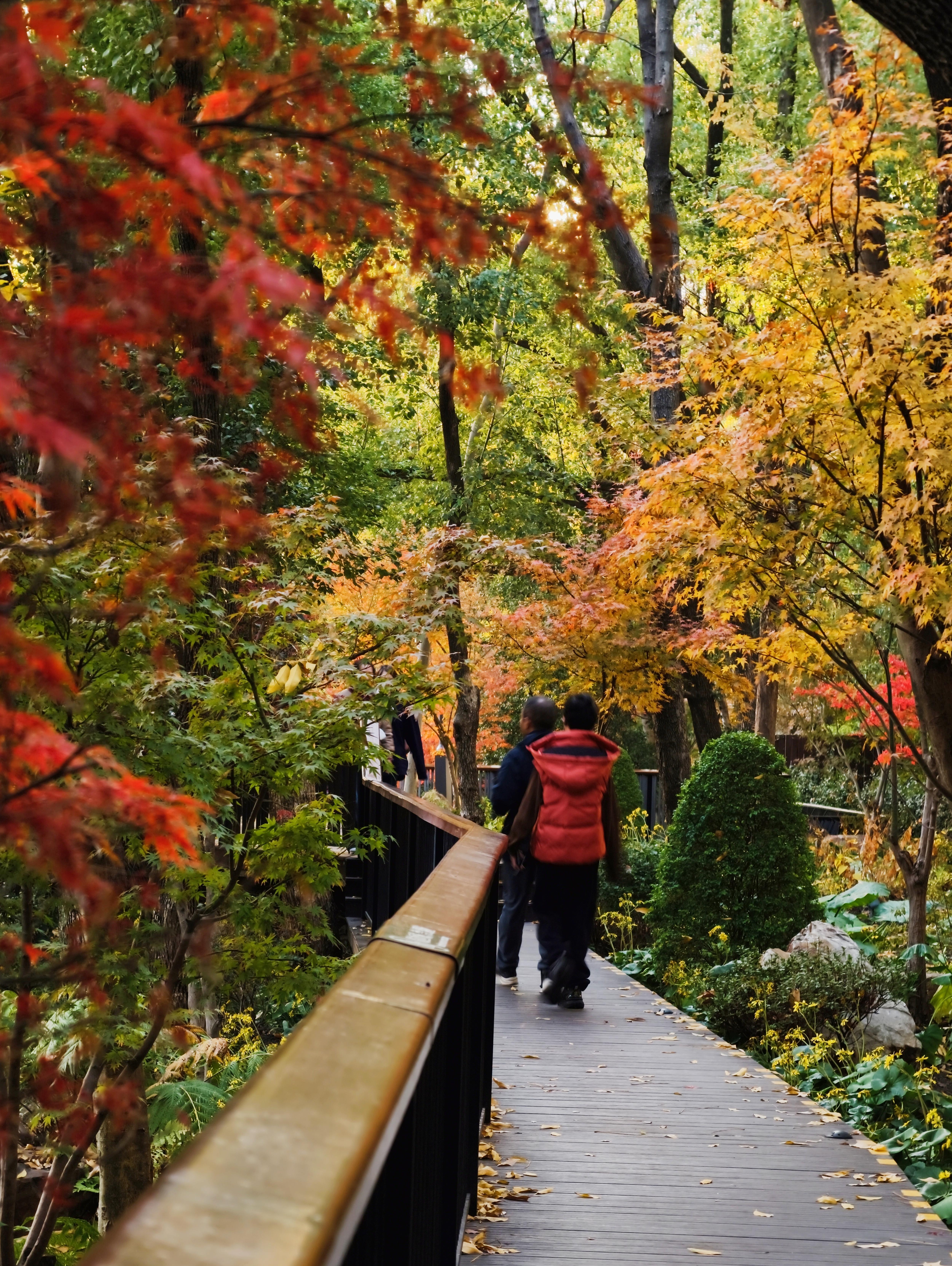 当你走入林木之间,会发现一个有趣的视角:那些挺拔的树干与舒展的枝桠,仿佛大自然精心布置的天然画框,将斑斓的叶色、洒落的光影,乃至行人悠然的身影,框成灵动鲜活的画面,如同一幅色彩浓郁到极致的印象派油画。