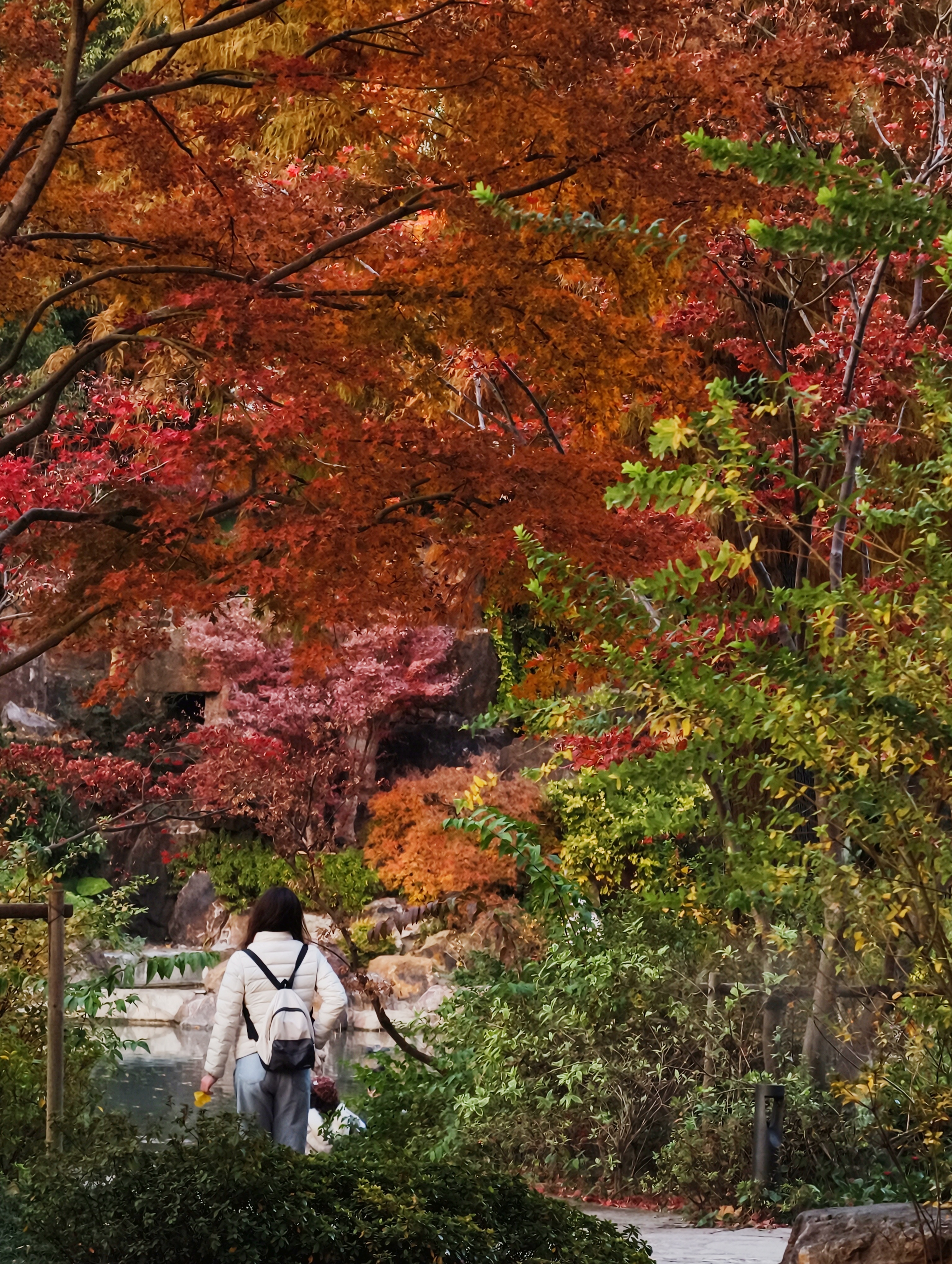 假山后方,一条步道掩映在斑斓的林叶之间,蜿蜒探向幽静处。沿步道徐徐前行,仿佛在上海市中心完成了一场浓缩版的“山林微徒步”。身侧景致随步伐移换,时而遇见一树灼目的红,时而俯瞰园中斑斓树冠和水景。