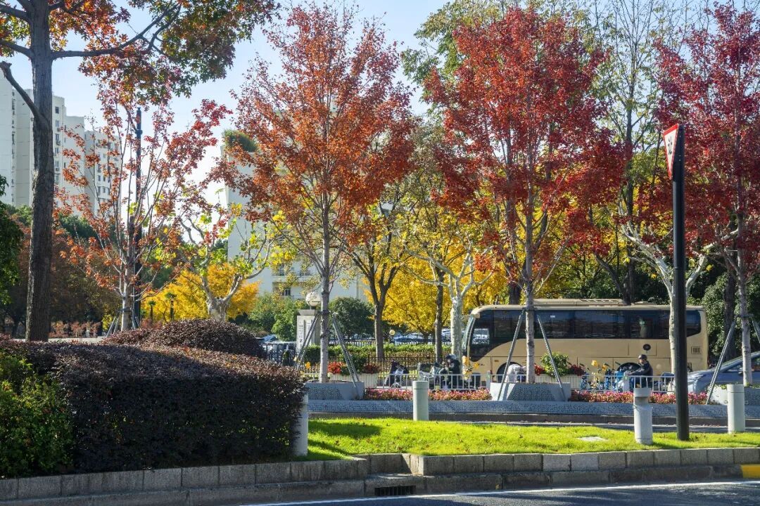 在普陀,这幅画卷有着丰富的载体。全区五万余株行道树中,除三万余株悬铃木外,还有银杏、樱花等共45种不同树种,其中包括24种色叶观花品种,共同编织成33条林荫道与9条绿化特色道路。2019年以来,全区持续推进“色彩化”建设,新增27条彩化道路,引入17个品种共3071株树木,让秋日街景愈发生动。