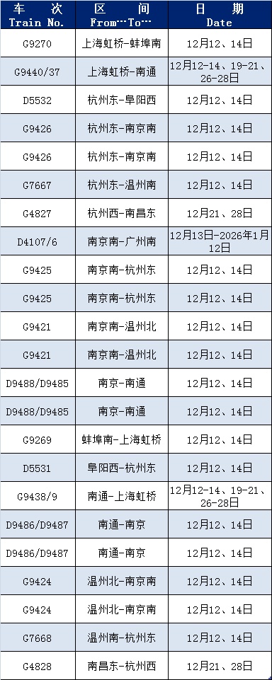 上海铁路客户服务中心介绍,根据旅客出行需求,铁路部门增开和恢复开行了部分旅客列车。增开列车包括G9270(上海虹桥-蚌埠南)、G9440/37(上海虹桥-南通)等;恢复开行列车包括D3010/1(上海虹桥-汉口)、G1523/2(上海南-武汉)等。赶快过来看看有没有您需要的车次吧!详见↓