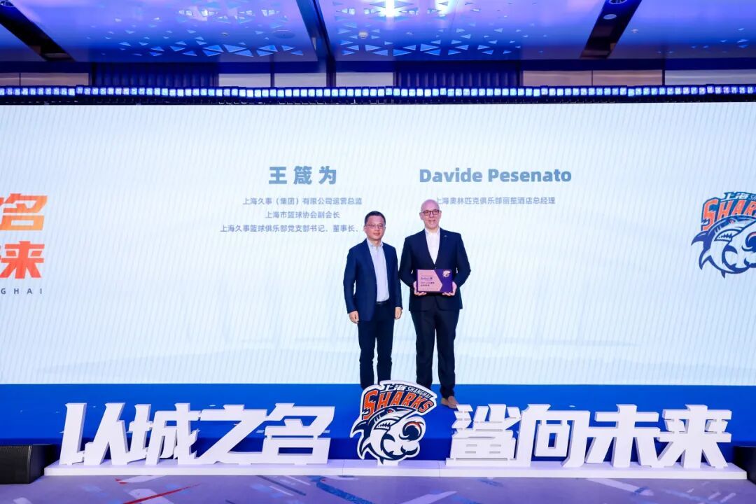 久事集团运营总监、上海市篮球协会副会长、久事篮球俱乐部党支部书记、董事长、总经理王箴为向新赛季官方合作伙伴奥林匹克俱乐部丽笙酒店授牌