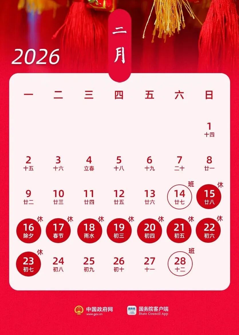 二、春节:2月15日(农历腊月二十八、周日)至23日(农历正月初七、周一)放假调休,共9天。2月14日(周六)、2月28日(周六)上班。