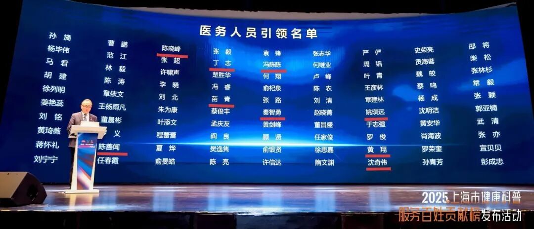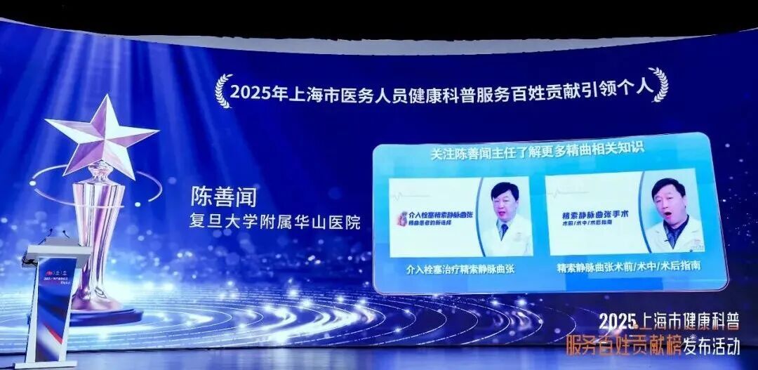 泌尿外科陈善闻副教授荣获“2025年上海市医务人员健康科普服务百姓贡献引领个人”。神经外科秦智勇教授、黄翔主治医师,胸心外科陈晓峰教授,肥胖疝外科姚琪远教授、沈奇伟副教授,泌尿外科冯陈陈副教授,内分泌科苗青副教授,整形外科丁志副教授等8人入选“2025年上海市医务人员健康科普服务百姓贡献引领名单”。
