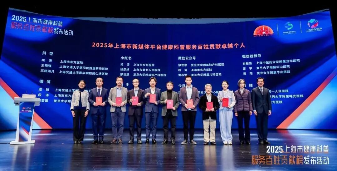 12月11日下午,上海市卫生健康委员会、上海市爱国卫生运动委员会办公室发布2025年上海市健康科普服务百姓贡献榜。华山医院荣膺2025年上海市健康科普服务百姓贡献榜榜首,共计10位医务人员荣膺个人榜单。来自全市医疗机构的领导、医务人员与科普工作者齐聚一堂,共同见证荣誉时刻。