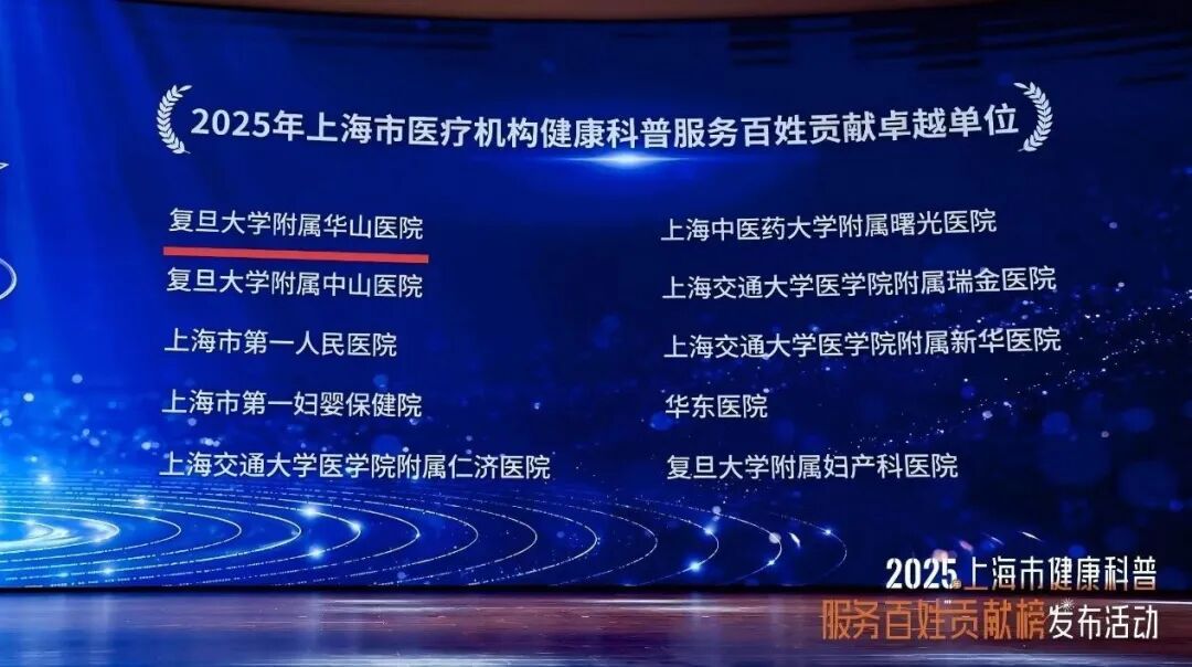 复旦大学附属华山医院荣获“2025年上海市医疗机构健康科普服务百姓贡献卓越单位”。