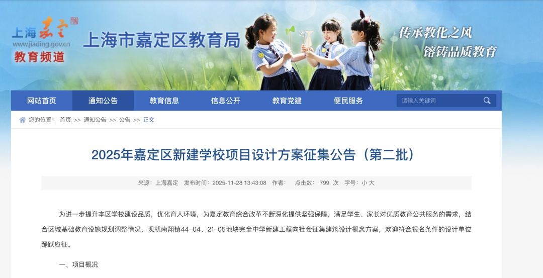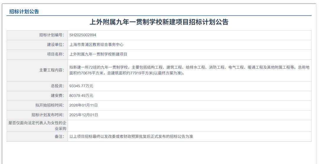 复旦附中嘉定学校启动建设,上海师大附属嘉定新城分校迎来首届学生……第一教育从各区教育局网站获悉,上海还将开办这几所九年一贯制学校,基础教育版图再扩容—— 1 今年6月,嘉定区教育局官宣,与复旦大学附属中学签订合作办学协议,将在南翔镇合作举办复旦附中嘉定学校。(可回顾相关报道——最新官宣:复旦附中嘉定学校来啦!一批家门口的好学校“加载”中) 第一教育从嘉定区教育局官网获悉,2025年嘉定区新建学校项目设计方案征集公告(第二批)发布,这所位于南翔镇44-04、21-05地块的新校启动建设,用地面积约79352平方米。 2 据嘉定区规划和自然资源局信息,菊园新区第一所公办九年一贯制学校正在规划建设,项目总用地面积达40708平方米,总建筑面积约为32114平方米。其中,地上建筑面积约27412平方米,主要包括教学楼、综合楼等设施地下建筑面积约4701平方米。 学校北至棋盘路、南至规划百悦路,东至规划铭泽路、西至永靖路,规划建设小学25个班、初中20个班。 3 12月1日,上外附属九年一贯制学校新建项目招标计划公告发布,新建学校“上海外国语大学附属青浦外国语学校(暂定名)”将在2026年1月11日开始招标。 今年4月,青浦区人民政府与上海外国语大学举行合作签约仪式。区校双方开启全面战略合作,培养具有“中国心、世界眼、创新脑”的未来人才,探索教育、科技、人才一体化发展的有效路径,为青浦全面高质量发展注入新的强劲动力。 招投标信息显示,上外附属九年一贯制学校为72班,总用地面积约70676平方米,总建筑面积约77919平方米(以最终方案为准),计划建设72个班级规模的九年一贯制学校。 4 今年9月,青浦区教育局与上海均瑶世外教育科技(集团)有限责任公司就委托管理赵巷国贸地块新建九年一贯制学校,正式签署合作协议。 双方将坚持创新合作与资源共享,促进区域义务教育优质均衡发展,发挥优质教育资源的品牌辐射作用,携手办好家门口的好学校。 赵巷国贸地块新建九年一贯制学校位于赵巷镇06-02、06-03地块,总建筑面积约45179.31平方米,设计规模54班。 青浦区教育局表示,此次合作办学将为区域学生提供更多元的教育资源,该校将于2026年9月正式开办。 5 11月29日,上海师大附中嘉定新城分校微信公众号上发布了上海师大嘉定基础教育集团2026招聘公告,招聘小学、初中教师若干名。 上海师范大学嘉定基础教育集团是上海师范大学首个区域基础教育集团,2025年10月被嘉定区教育局认定为紧密型学区集团。