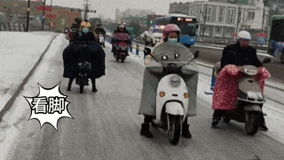 在冰雪道路上下坡道、急转弯路段应下车推行。电动自行车轮胎不要充气太足,这样可以增加与地面摩擦,不易滑倒。如果有积雪,车速控制在15km/h以内,脚伸到踏板两侧接近地面,参考以下动图。
