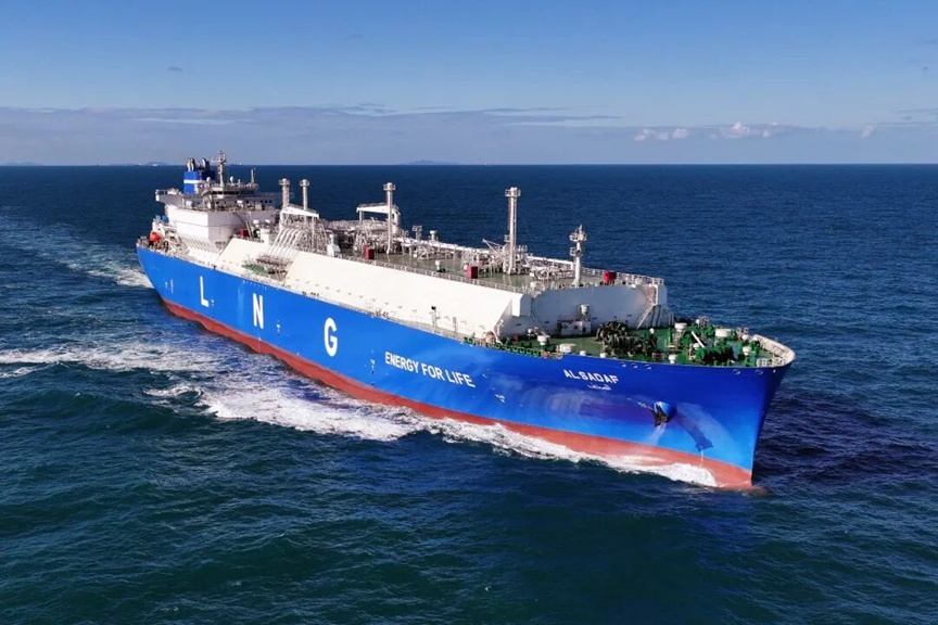 12月10日,江南造船为阿布扎比国家石油公司(ADNOC)建造的大型Mark III Flex薄膜式LNG船系列船第四艘船“AL SADAF”命名交付,标志着江南造船 2025 年批量交付系列船 3 艘(H2701-2703 船)的年度任务顺利完成。